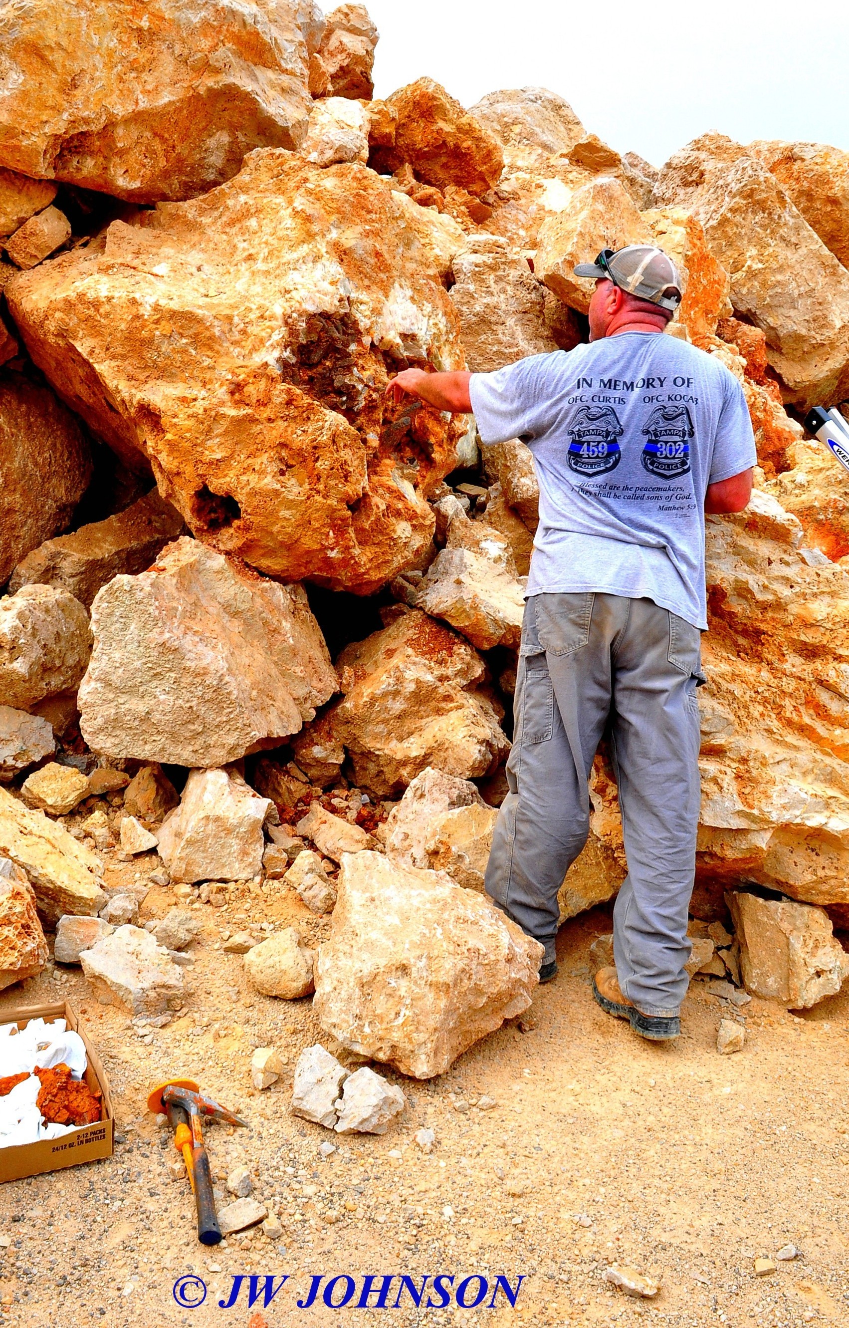 067 Chuck Points Out Large Calcites in Boulder