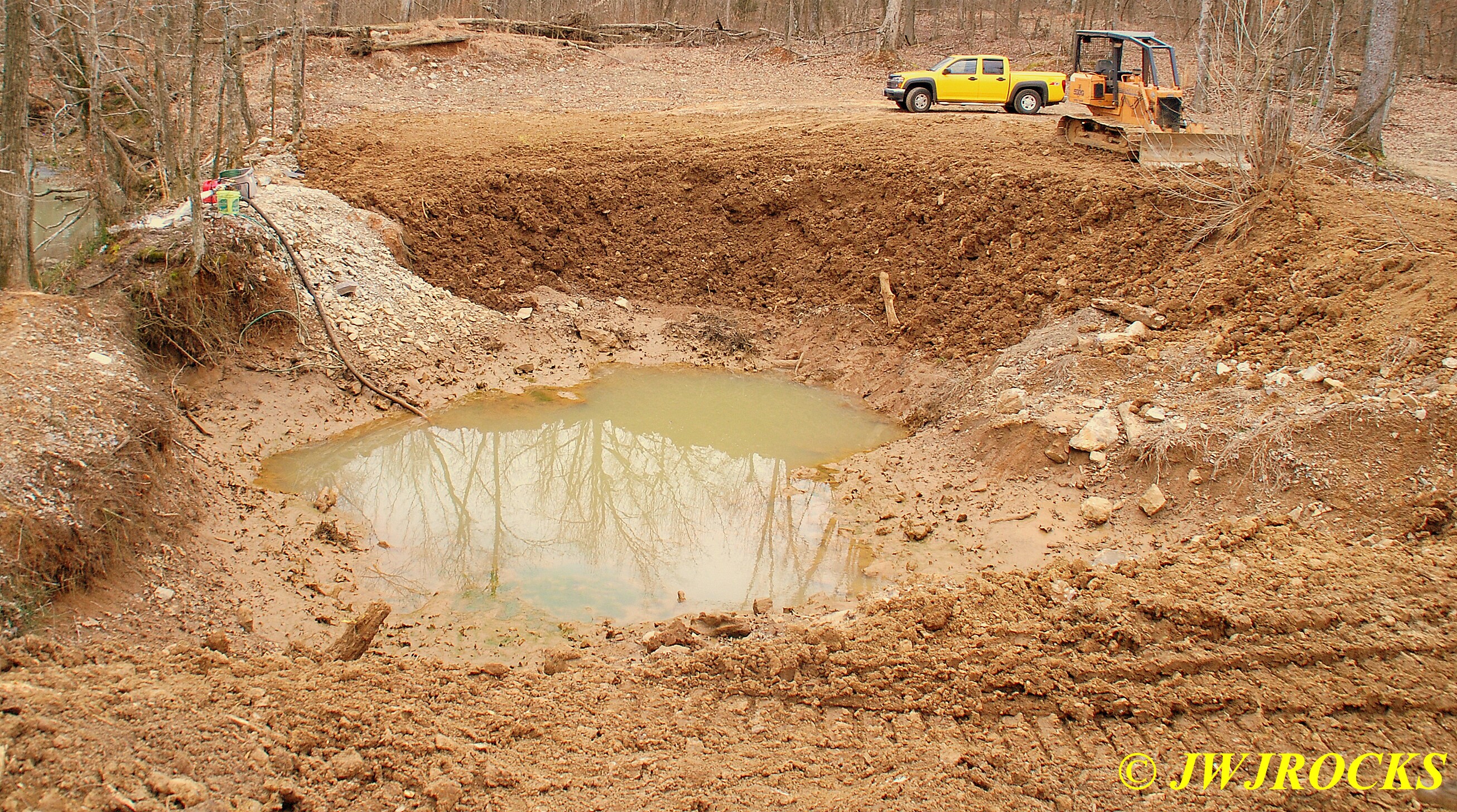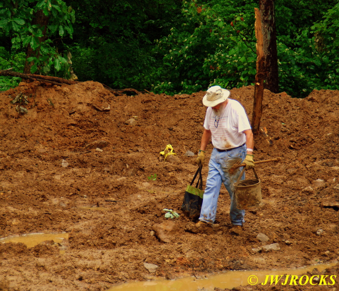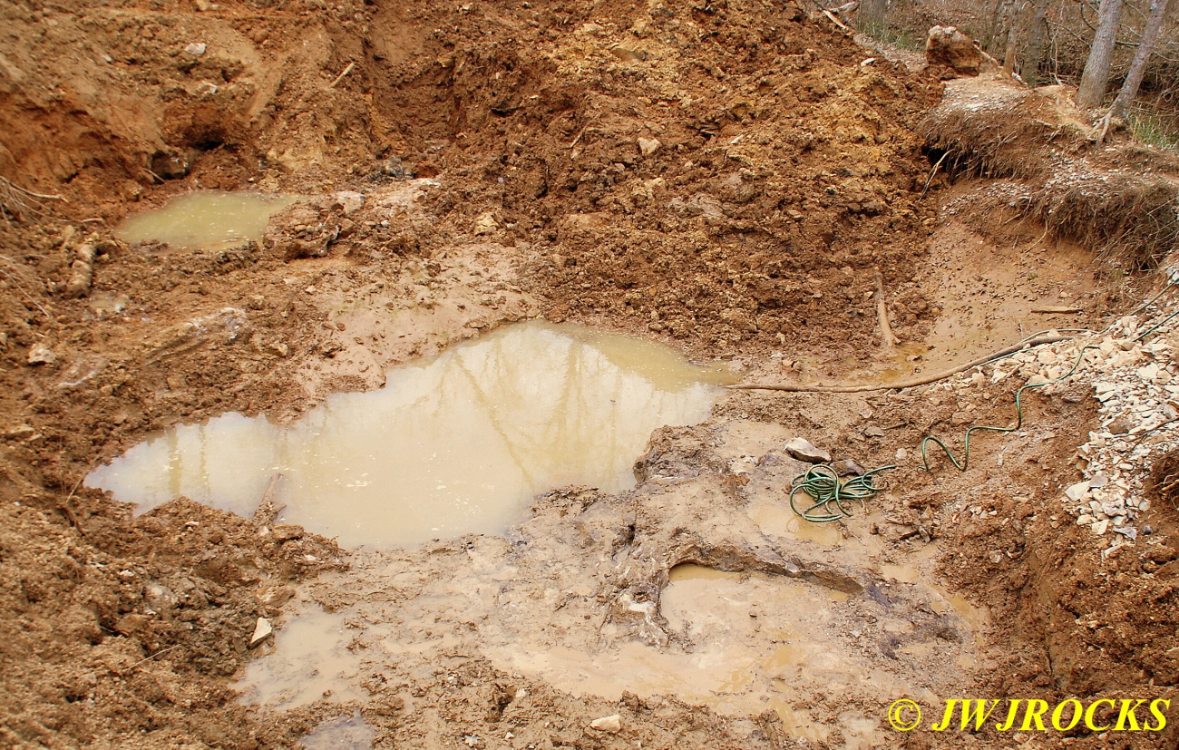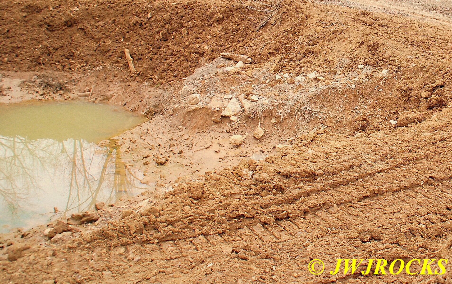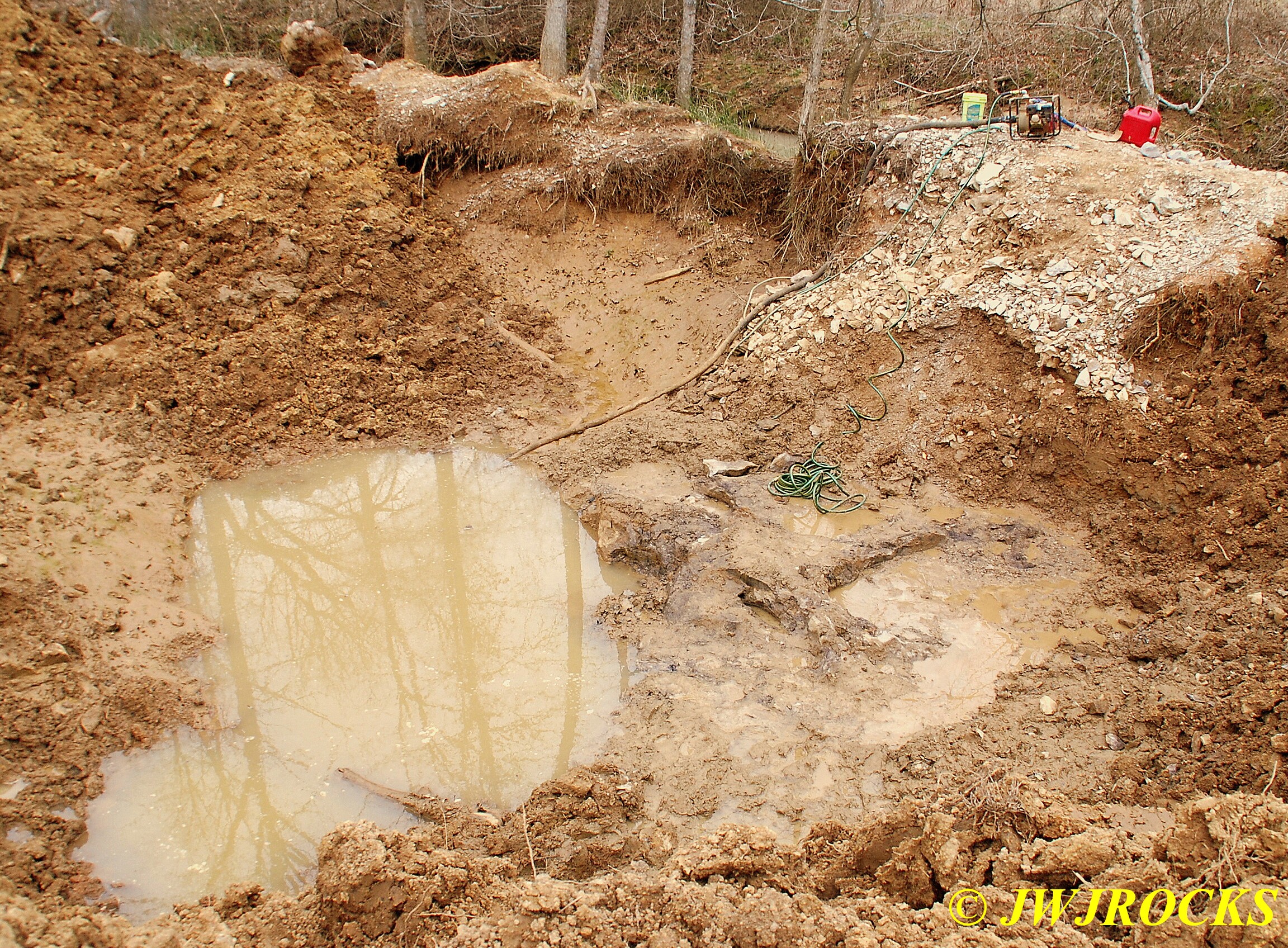 David drove down early the next morning from Paducah, and was at the mine when Chuck, Jimmy and I arrived…we passed the trackhoe and operator as we drove down the hill to the mine. He followed us down to get instruction and directions on how to get the trackhoe down to the mine, and we found out his name is Marlon….he had never dug there and was unfamiliar with that particular area, but knew as we did, that the sixty thousand pound machine would not be able to cross the little metal bridge over the creek at the foot of the hill. I showed him how to drive down the hill through the fields on the other side of the road and the cattle crossing in the creek, offered to walk him down and assist with the gates, but he said he would be fine, and so we set about getting things ready while he returned to do just that. The new pit that we had dug out last year over the course of two separate machine digs, had weathered the winter pretty good, yet was full of water on one end while high and dry, so to speak, on the other….