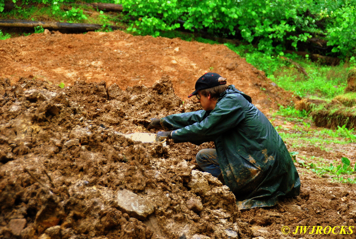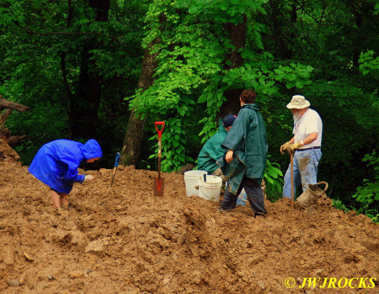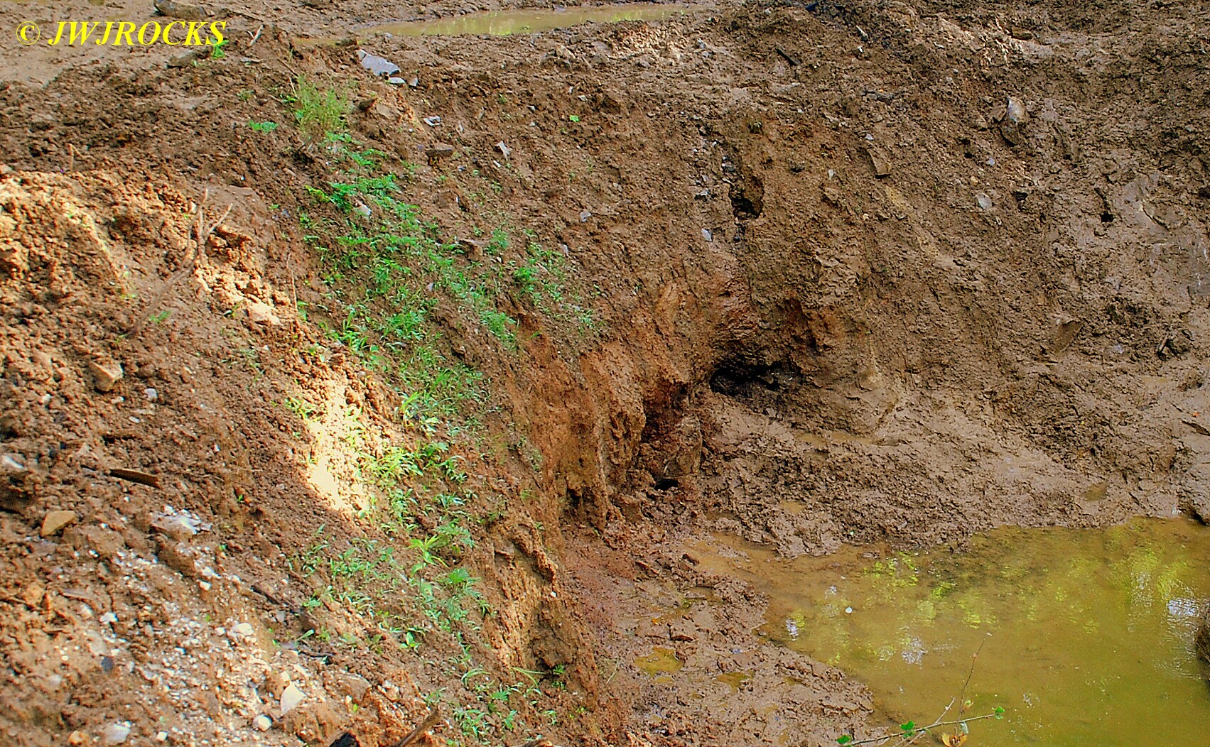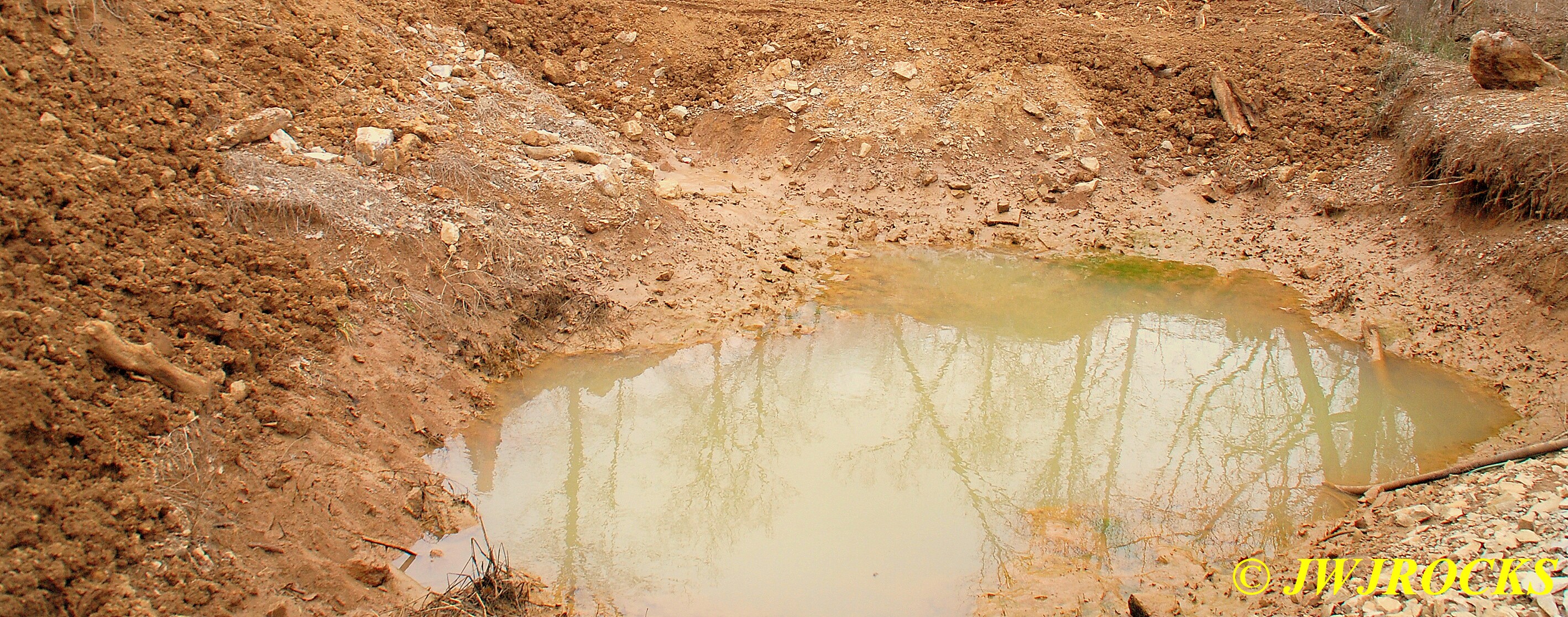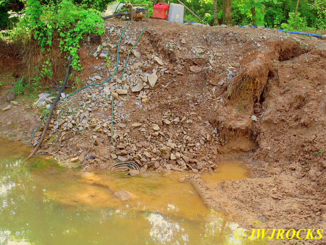 David drove down early the next morning from Paducah, and was at the mine when Chuck, Jimmy and I arrived…we passed the trackhoe and operator as we drove down the hill to the mine. He followed us down to get instruction and directions on how to get the trackhoe down to the mine, and we found out his name is Marlon….he had never dug there and was unfamiliar with that particular area, but knew as we did, that the sixty thousand pound machine would not be able to cross the little metal bridge over the creek at the foot of the hill. I showed him how to drive down the hill through the fields on the other side of the road and the cattle crossing in the creek, offered to walk him down and assist with the gates, but he said he would be fine, and so we set about getting things ready while he returned to do just that. The new pit that we had dug out last year over the course of two separate machine digs, had weathered the winter pretty good, yet was full of water on one end while high and dry, so to speak, on the other….