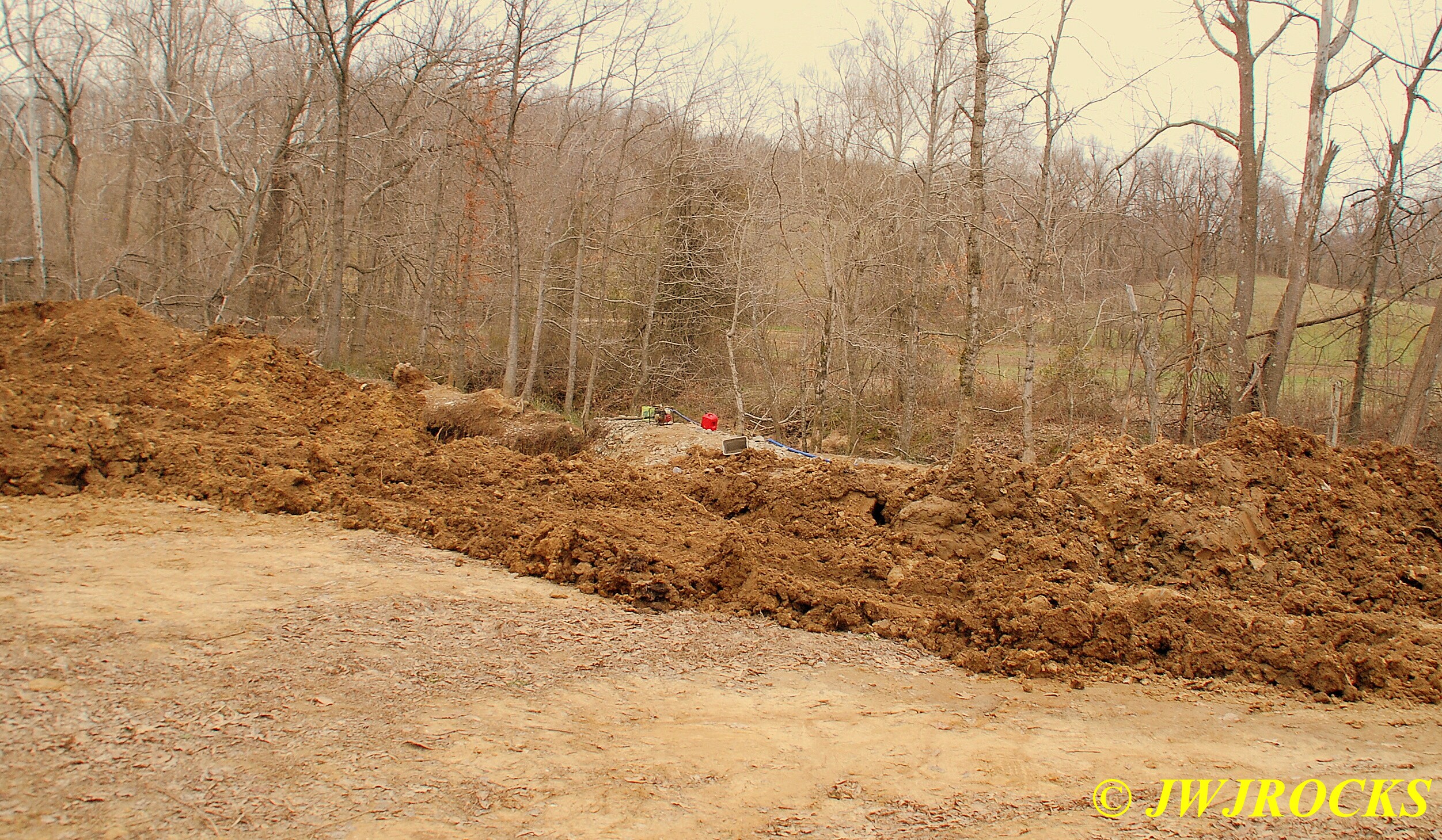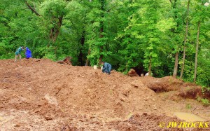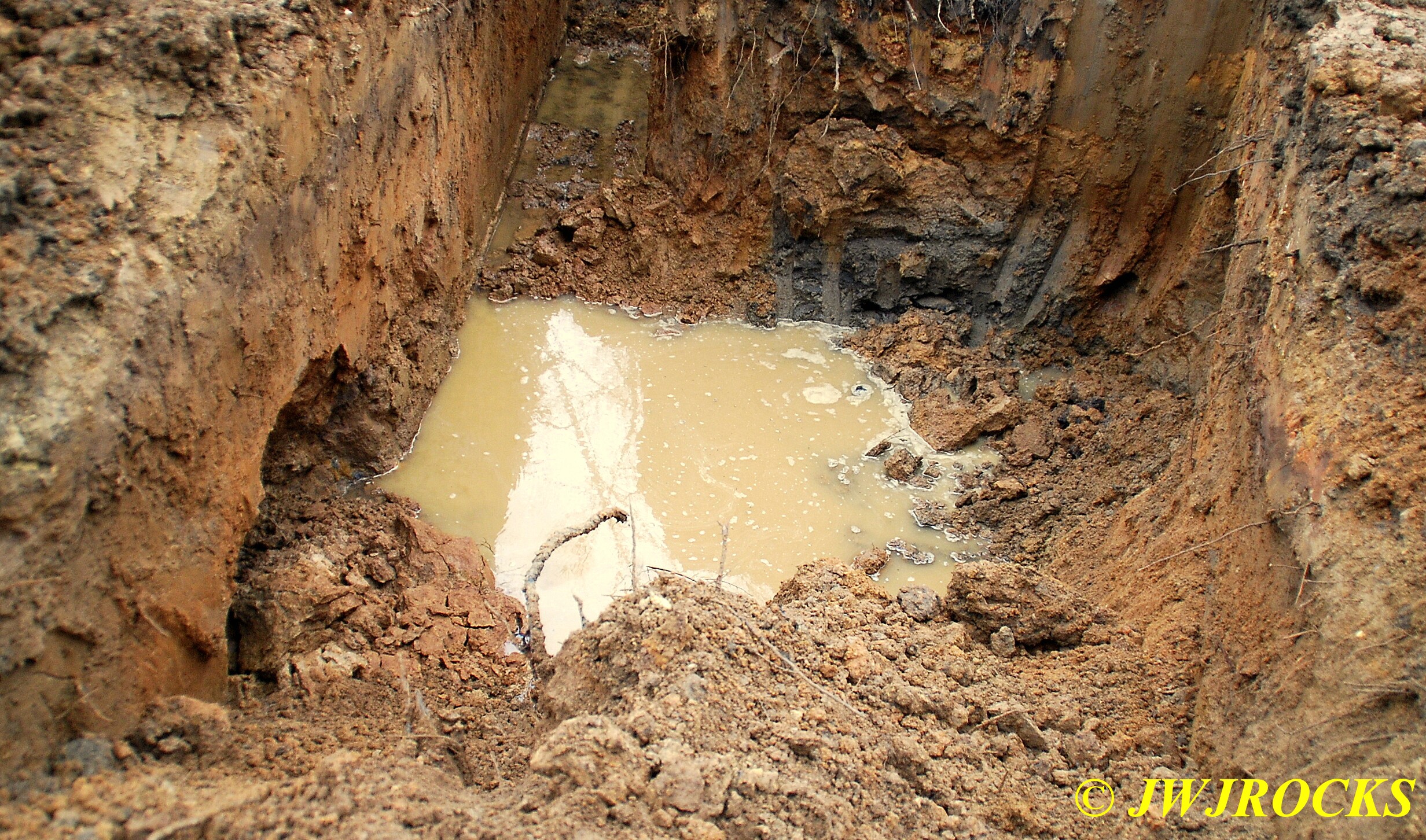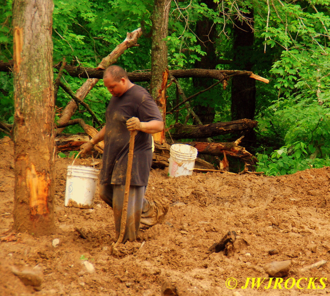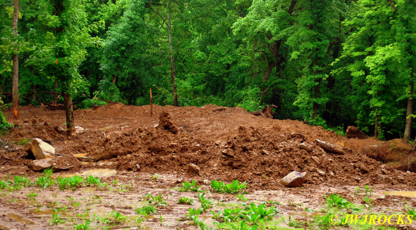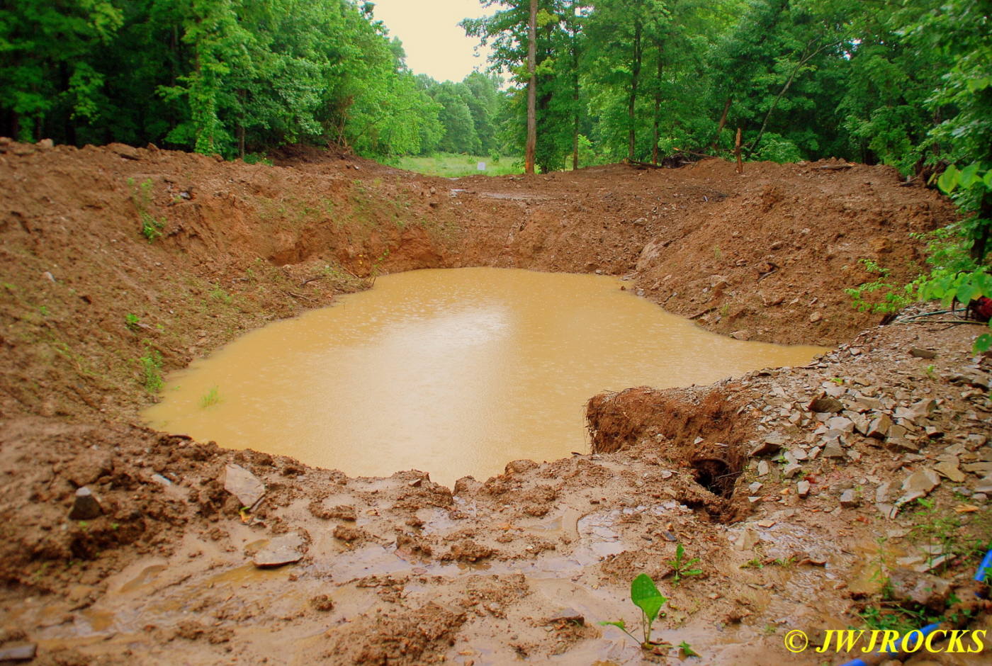 David drove down early the next morning from Paducah, and was at the mine when Chuck, Jimmy and I arrived…we passed the trackhoe and operator as we drove down the hill to the mine. He followed us down to get instruction and directions on how to get the trackhoe down to the mine, and we found out his name is Marlon….he had never dug there and was unfamiliar with that particular area, but knew as we did, that the sixty thousand pound machine would not be able to cross the little metal bridge over the creek at the foot of the hill. I showed him how to drive down the hill through the fields on the other side of the road and the cattle crossing in the creek, offered to walk him down and assist with the gates, but he said he would be fine, and so we set about getting things ready while he returned to do just that. The new pit that we had dug out last year over the course of two separate machine digs, had weathered the winter pretty good, yet was full of water on one end while high and dry, so to speak, on the other….