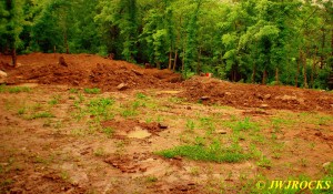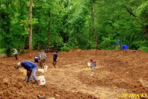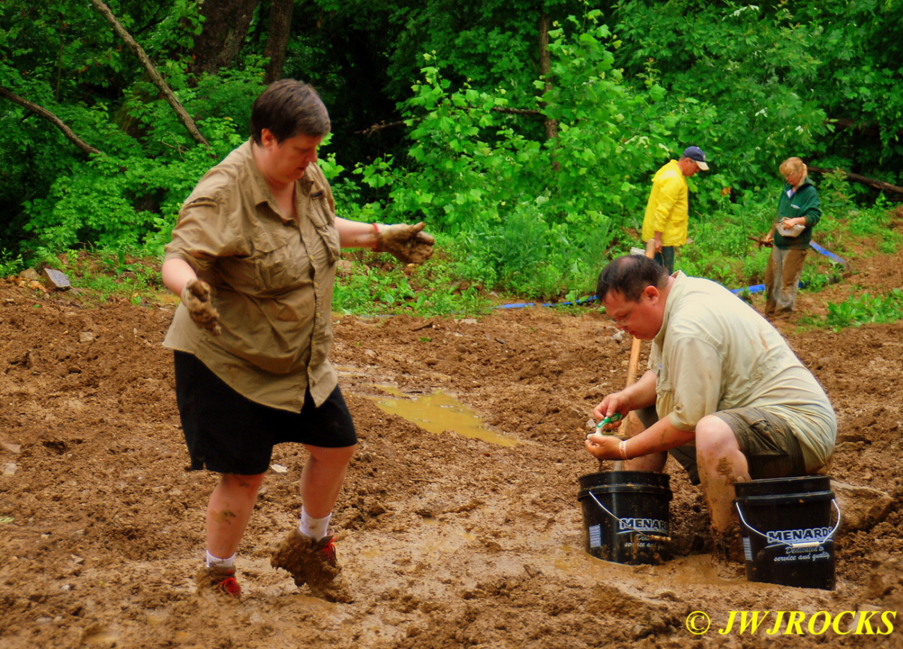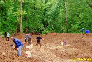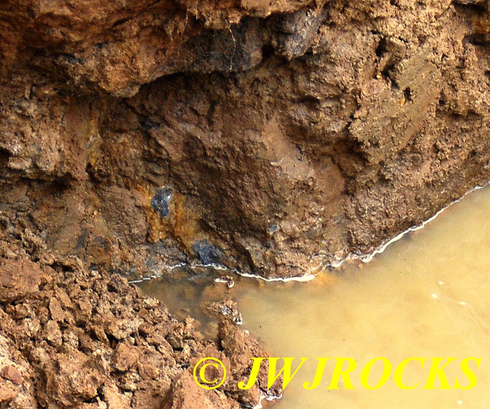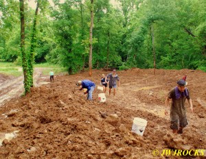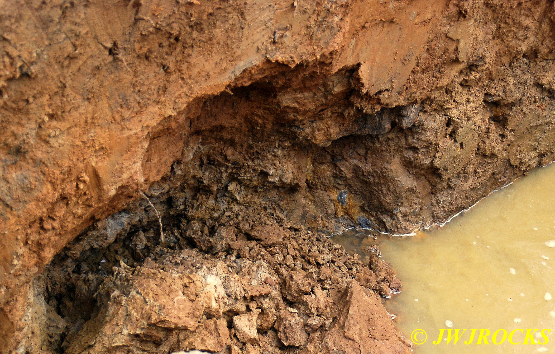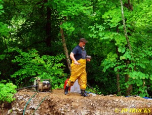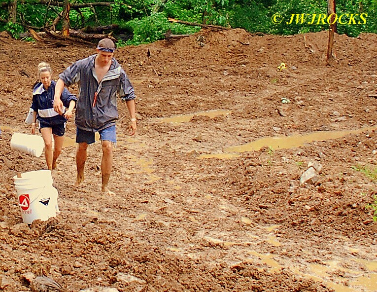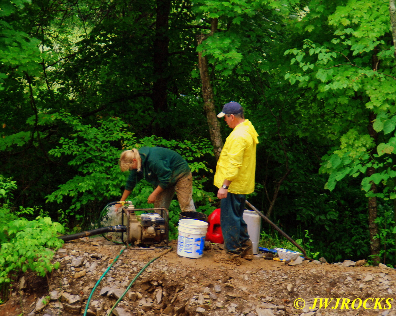 David drove down early the next morning from Paducah, and was at the mine when Chuck, Jimmy and I arrived…we passed the trackhoe and operator as we drove down the hill to the mine. He followed us down to get instruction and directions on how to get the trackhoe down to the mine, and we found out his name is Marlon….he had never dug there and was unfamiliar with that particular area, but knew as we did, that the sixty thousand pound machine would not be able to cross the little metal bridge over the creek at the foot of the hill. I showed him how to drive down the hill through the fields on the other side of the road and the cattle crossing in the creek, offered to walk him down and assist with the gates, but he said he would be fine, and so we set about getting things ready while he returned to do just that. The new pit that we had dug out last year over the course of two separate machine digs, had weathered the winter pretty good, yet was full of water on one end while high and dry, so to speak, on the other….