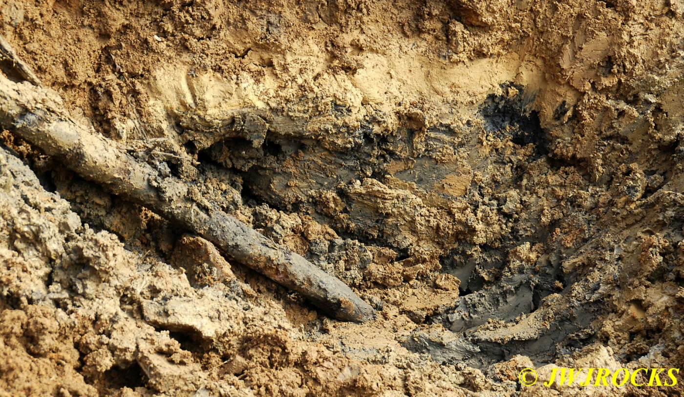 We didn`t locate much of anything on this side, following some hunches, and the water table is very high here too, we were down maybe ten feet when Marlon punched thru some base rock and water started gushing into the trench cut…that alone would have made it extremely difficult to dig in even if we had found anything worthwhile there. It was noon by then and we decided to break for lunch. Bill had kept in contact with us all morning by phone, checking on our progress, so I called him once again to let him know where we were at. He was in Paducah but on his way back and said he would come by to discuss another place to dig at. Jimmy drove Marlon back up the hill to his truck so he wouldn`t have to hoof it up there, and he drove back down in his truck after his lunch break.