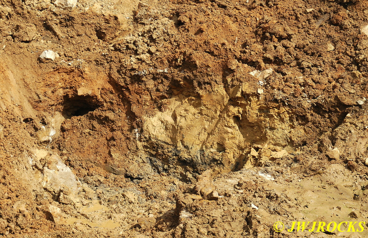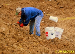 …I had never seen large limestone/dolomite boulders like the ones he pulled out of the pit and piled up on the road, they were water worn and smooth with rounded corners where once I am sure, they had hard sharp edges. Tina drove down later and was immediately both drawn and taken with them, she wanted to take a couple of them home with her…one was even big enough to serve as a small picnic table. Once finished with that, I had Marlon dig a trench on the north side of the old pit to see if we could locate the old horizontal tunnel that we had followed in the first ten years of our machine digs, when we found quite a bit of good to great specimens along the way. Jimmy photographed me standing at the edge of the trench cut that Marlon is making for us, again it looks as though I am in the pit from the angle taken, but rest assured I am standing up on the bank and a couple of feet from the edge….