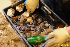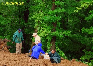 We all donned our hard hats, boots, grabbed buckets, bags, and tools, and then listened as Phil explained the mechanics of the quarry and showed us the fault….which is that slanted white line on the right in the third photo down from here….