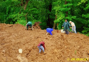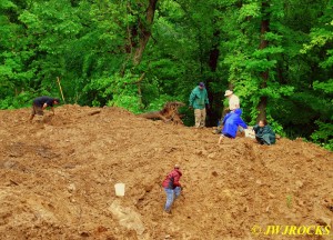 I decided to dig into an area a few feet up the hill from the bottom that looked to be a seam or opening across the pile about thirty feet long…I had my small extendable  potato rake with me and started raking a few rocks out and on the second try, I pulled two chunks of fluorite out about the size of a loaf of bread…was beginning to think I might be on to a pocket and said as much to Travis, so he came down and joined me on the right side of that seam. I reached in and pulled out yet another one and then called out to Jim and Mark…Mark soon came down to see what I had found and decided to join us there as well…eventually Jim came down and joined us on the left side too….