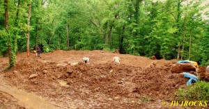 While the guys continued to dig out what they could find in the trench, I had Marlon cut a new temporary road thru the edge of the forest and back over to the main north side…he first piled some dirt and rocks up on both sides of the road cut, and we also staked a line across with some fence posts….