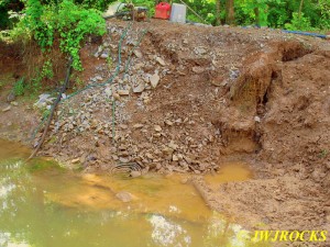 This year, I consulted with one of my geologist friends Mike Streeter, who knows the area well and Bill as well, and we decided to explore under the logging road to see if the vein continued in that direction. Bill also asked if we could fill in the deep water hole on the east side of the new pit, so we had Marlon take care of that job first…here you see the new pit below and the deep water hole in the upper part of the image, as well as the pocket producing saddle in the lower part of the image…