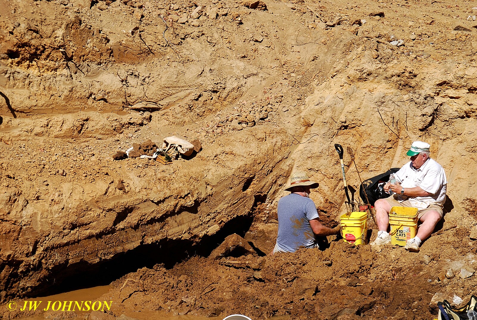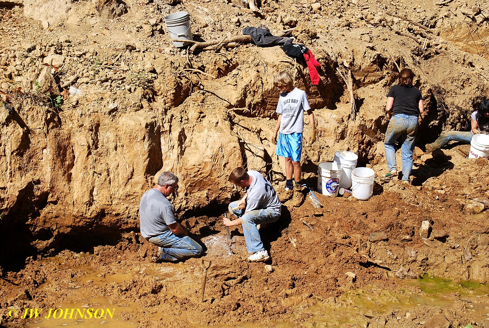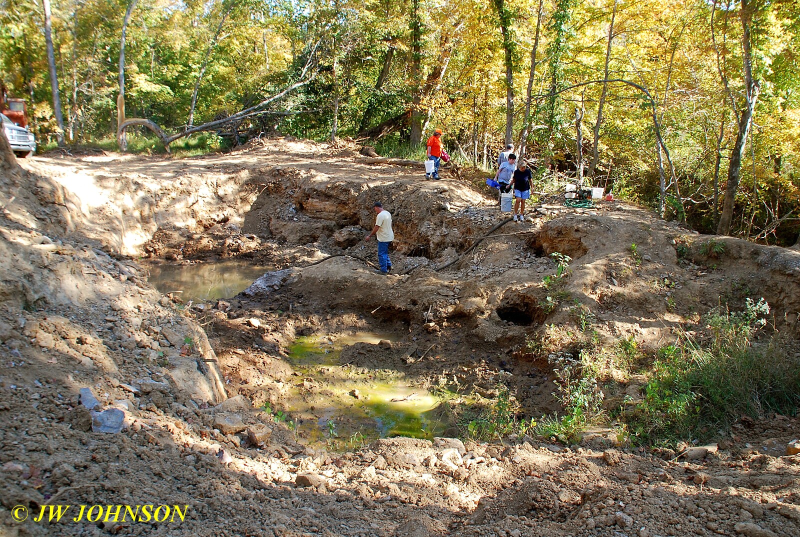 …by mid afternoon, Mike and Chrissy loaded up for their seven hour drive home and I left about an hour later….there were four left in the pit by this time and the pump was kicked on for a little more lowering of the water level to explore for more pockets…within a few minutes the big pit was drained dry and the smaller pit lowered to explore a pocket or two…I reached down into one of the smaller pit pockets and a large frog came jumping across my arm and hand and out of the pit….and naturally as startled as I was, I let out with a loud word or two and everyone looked up to see the frog flying through the air.