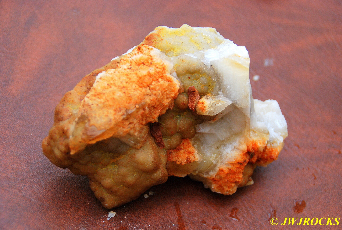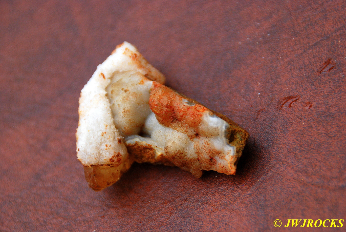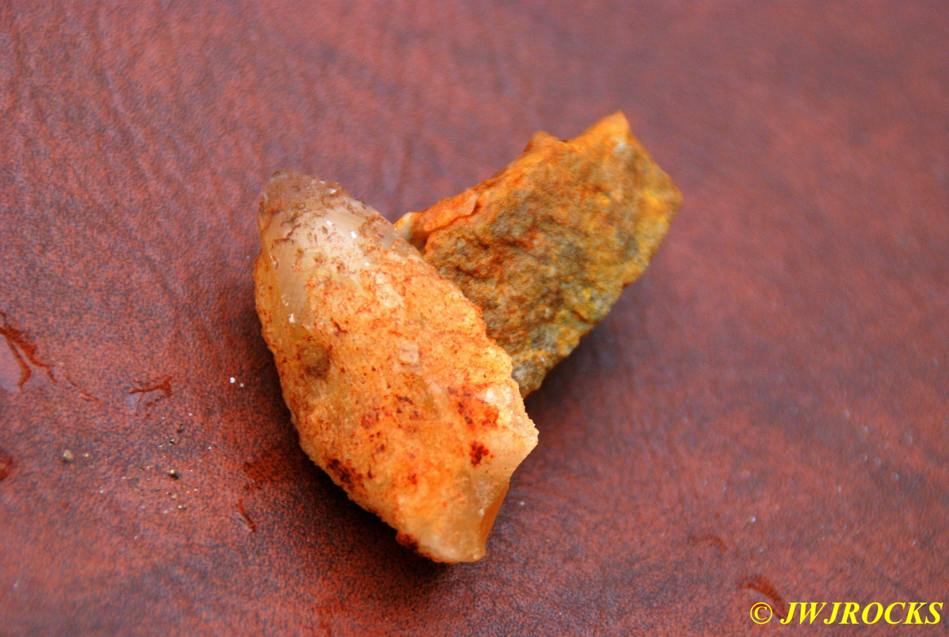 …I filled three bags after wrapping up these and some of the single crystals, and took them to the truck…as I walked back toward the wall, I looked down where I was watching my steps over some loose boulders and saw some poker chip crystals laying at the bottom of the pile slope…so I looked up and spotted what appeared to be a large chunk of poker chips and druse exposed on one end near the top of the pile…so naturally, I climbed up there and started digging in to expose the entire thing, and before you knew it, several dogtooth orange crystals were found in what appeared to be a large pocket blasted down from the wall. I pulled a couple of large plates out and took them back to the truck, and brought back an extra bag with cloth wraps. Its a good thing I did, because an hour later, I had filled both bags and was returning to my truck for yet another one, when Docia came to tell me that she had froze out and had enough of the never ending wind.