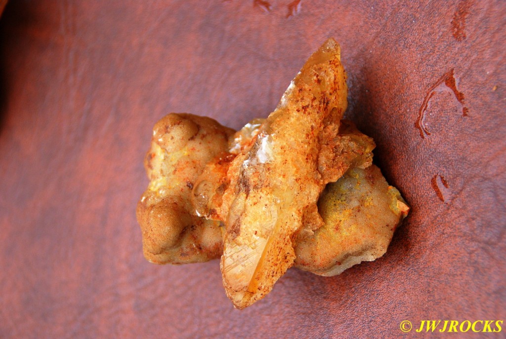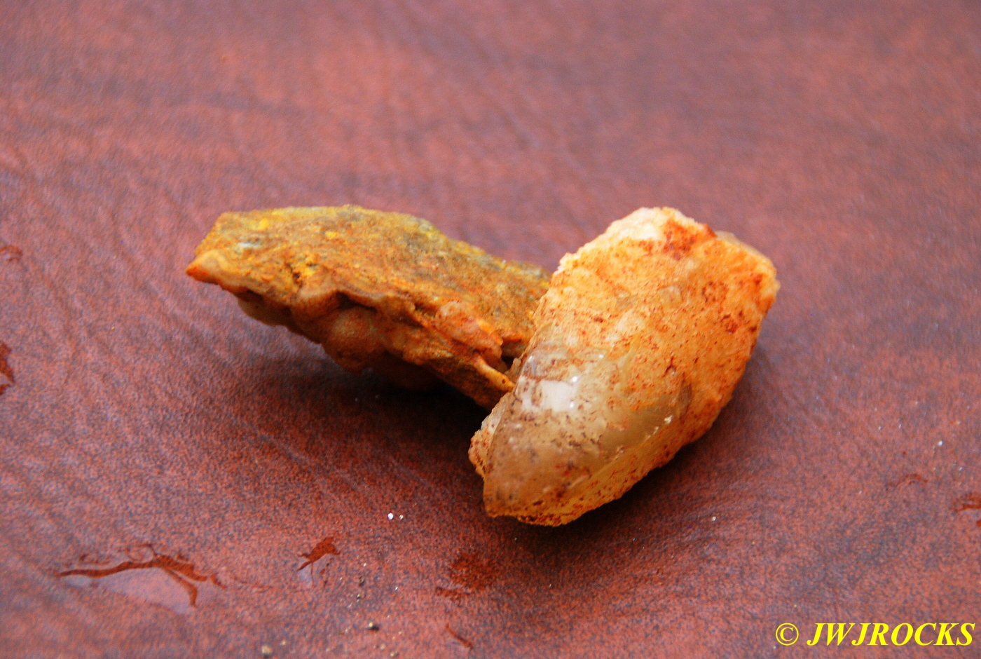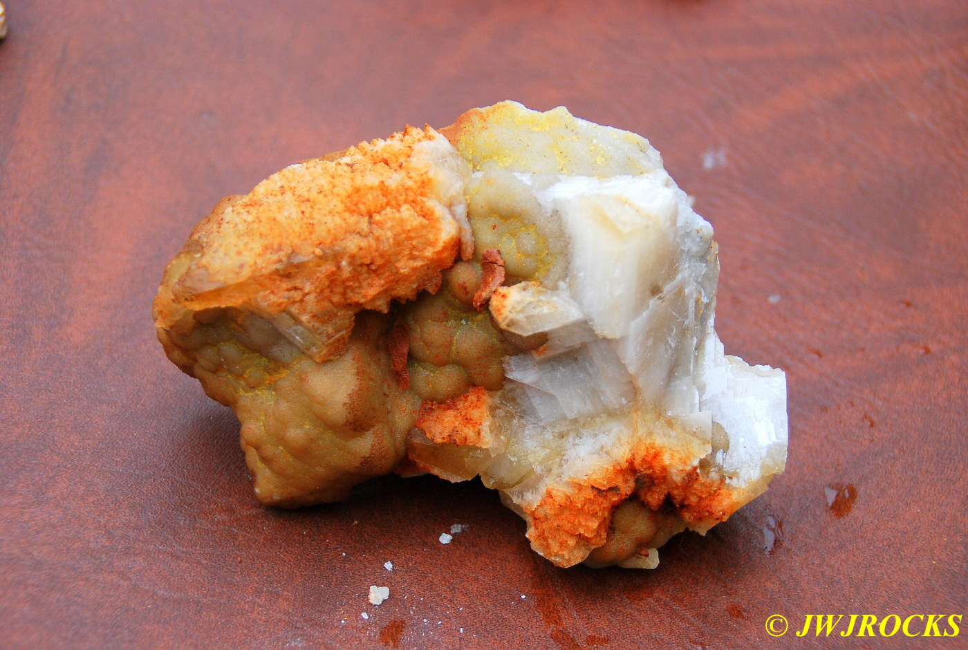 …I filled three bags after wrapping up these and some of the single crystals, and took them to the truck…as I walked back toward the wall, I looked down where I was watching my steps over some loose boulders and saw some poker chip crystals laying at the bottom of the pile slope…so I looked up and spotted what appeared to be a large chunk of poker chips and druse exposed on one end near the top of the pile…so naturally, I climbed up there and started digging in to expose the entire thing, and before you knew it, several dogtooth orange crystals were found in what appeared to be a large pocket blasted down from the wall. I pulled a couple of large plates out and took them back to the truck, and brought back an extra bag with cloth wraps. Its a good thing I did, because an hour later, I had filled both bags and was returning to my truck for yet another one, when Docia came to tell me that she had froze out and had enough of the never ending wind.