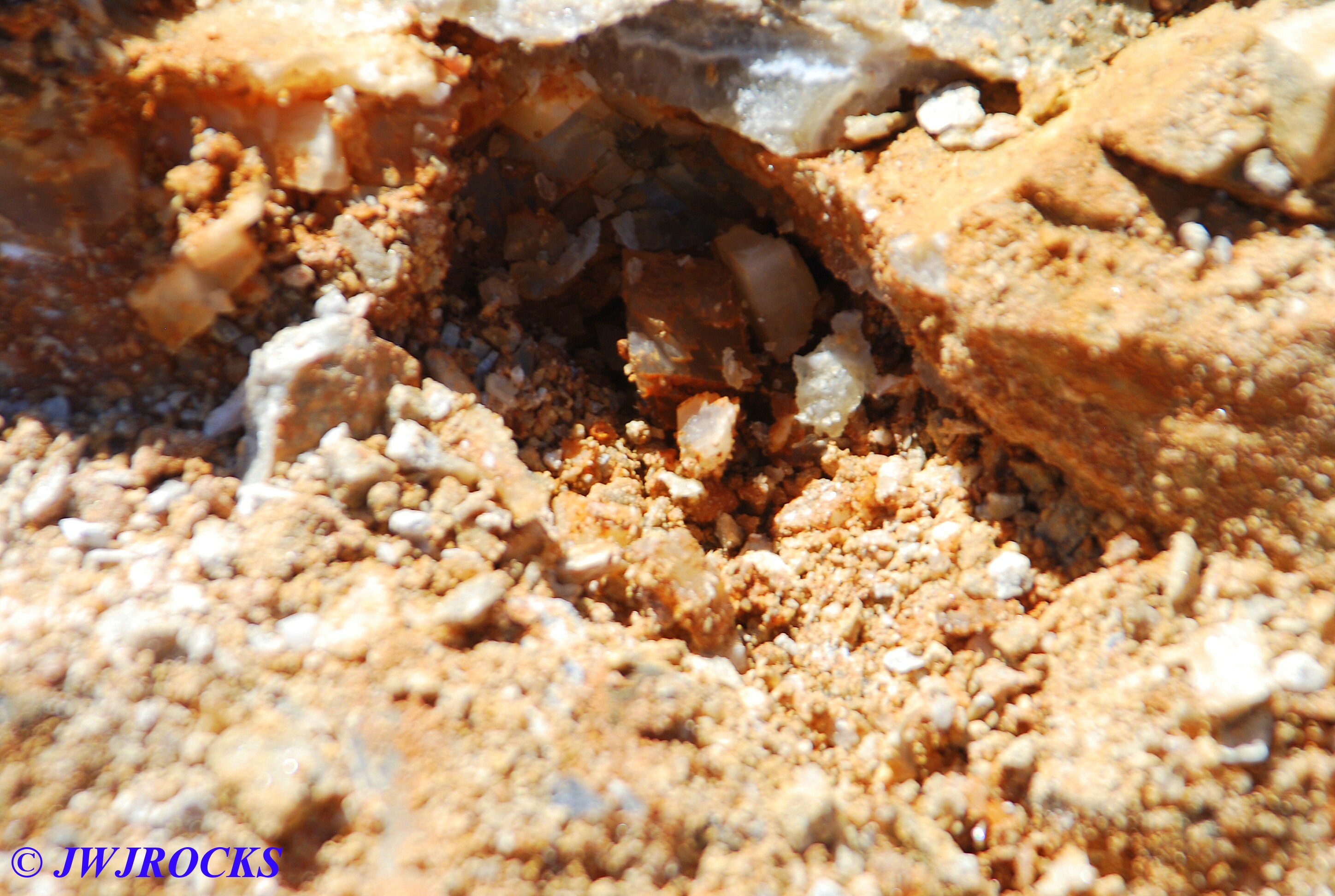 ….he has a few forms of iron covering some druse including hematite and limonite, and he has a lot of Missouri Lace Agate there as well. Greg and his staff operate side by side UTV`s and can transport rockhounds and their buckets/tools, from the time of their arrival and filling out the paperwork, to any spot on the farm, as well as pick them back up to return them to their vehicle, or take them to another collecting spot on the farm. They will do all the heavy lifting of your filled buckets as well. Greg also has at least one porta pottie on site…during the first year of operation he was placing a porta pottie at each of the popular spots on his farm and thru the summertime, he was placing large foam coolers at each spot, filling them with ice and bottled water, to keep the rockhounds hydrated. Greg hosts events each year there and at times, had an ATM machine on site. He quickly outgrew the small parking lot behind his house, so he then built a huge parking area under the canopy of trees back behind his lake, located 100 yards behind his house and smaller parking lot, and created a road leading to it from the main road leading to his house. That road is lined with huge boulders of druse quartz in every color and form imagineable.