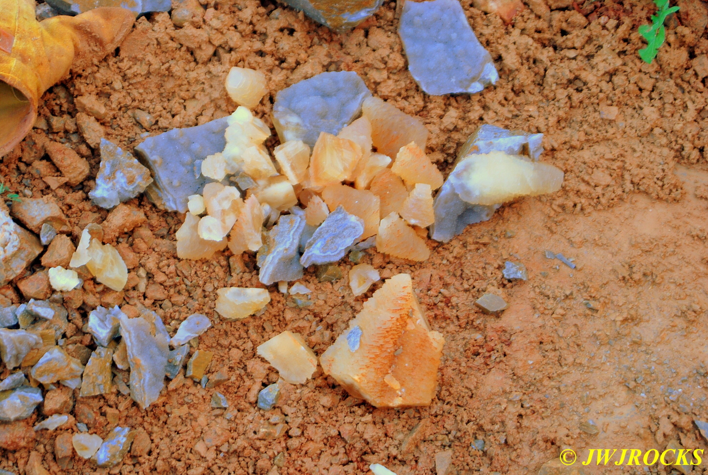 We started at the creek just inside the entrance and below the lake…Daniel and his family members dug the lake out to create a fishing and recreational lake, so it wasn`t a tailings lake like some mine sites have. The dirt they dug out tho, was chock full of beautiful druse quartz and barite in a few interesting forms…like hundreds of soda straw plates with the straws reaching 2 inches in length, many in colors of a vivid blue and purple, yellows, and some were coated with hematite black coloring, some with metal tips extending out the tips of the straws….