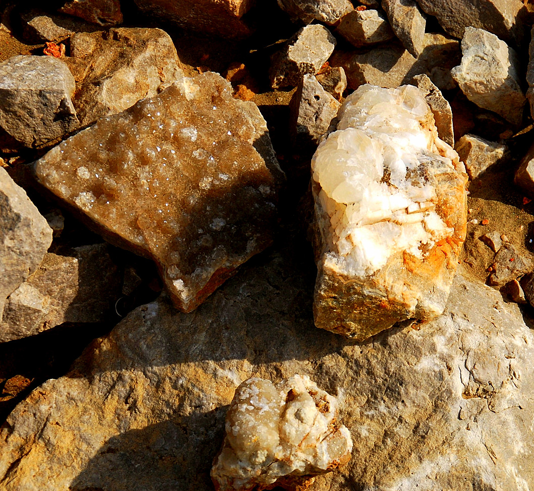 After that I put my camera away and we concentrated on finding pockets of beautiful fluorite crystals, many of them laden with calcite crystals, some with greenockite, and all over the place…pry bars were used and several large plates were liberated from the fractures of limestone…the following photos will give you a good idea of what we found last Friday…
