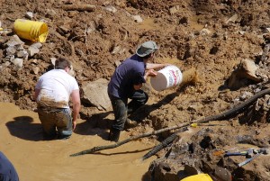 ….Jeff worked the pump while Bill assisted in the pit moving the hose around to get as much water as possible out….Mike and Thomas worked at finding some pockets to work while this was going on and liberated a few large chunks of fluorite while waiting for the water level to go down…