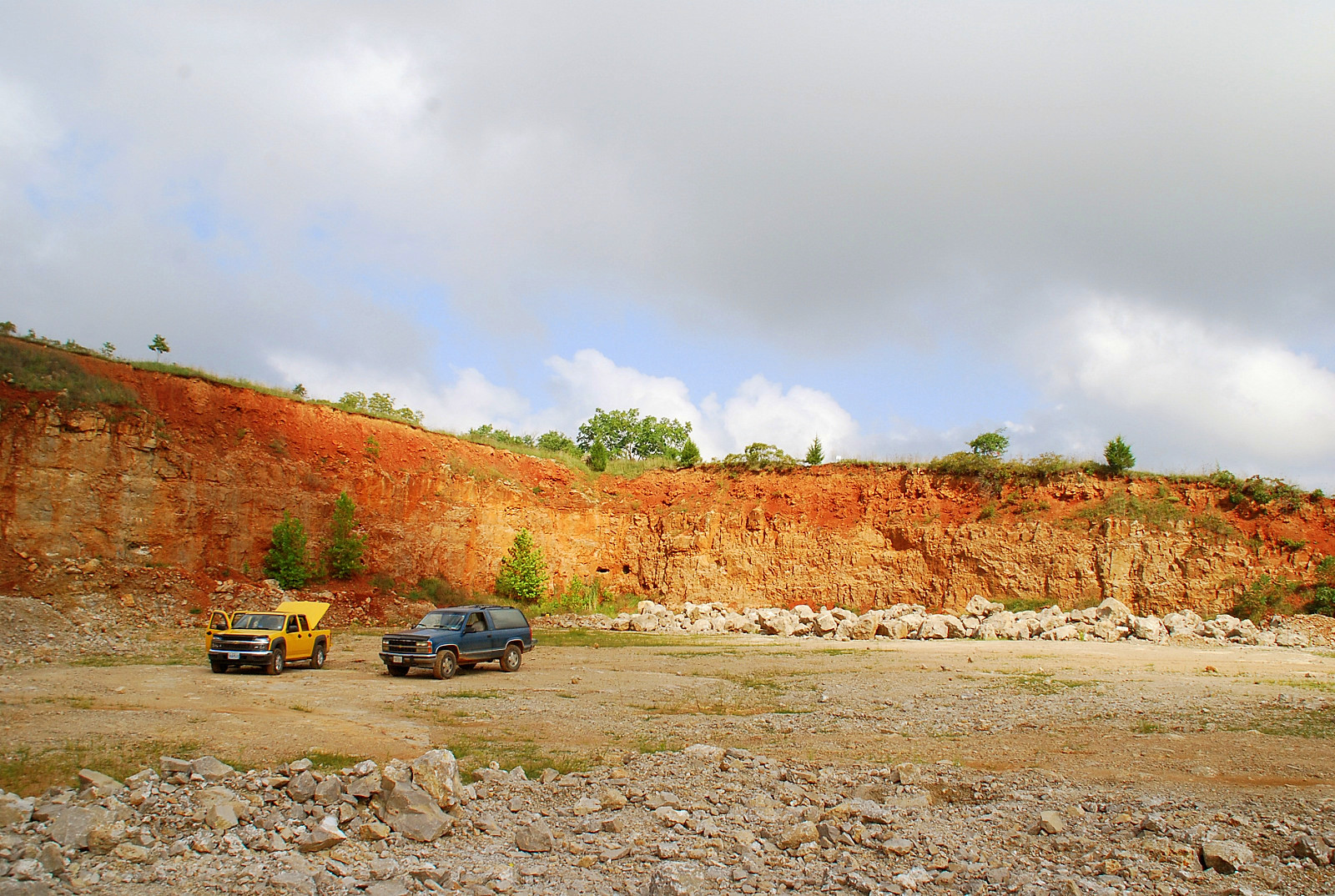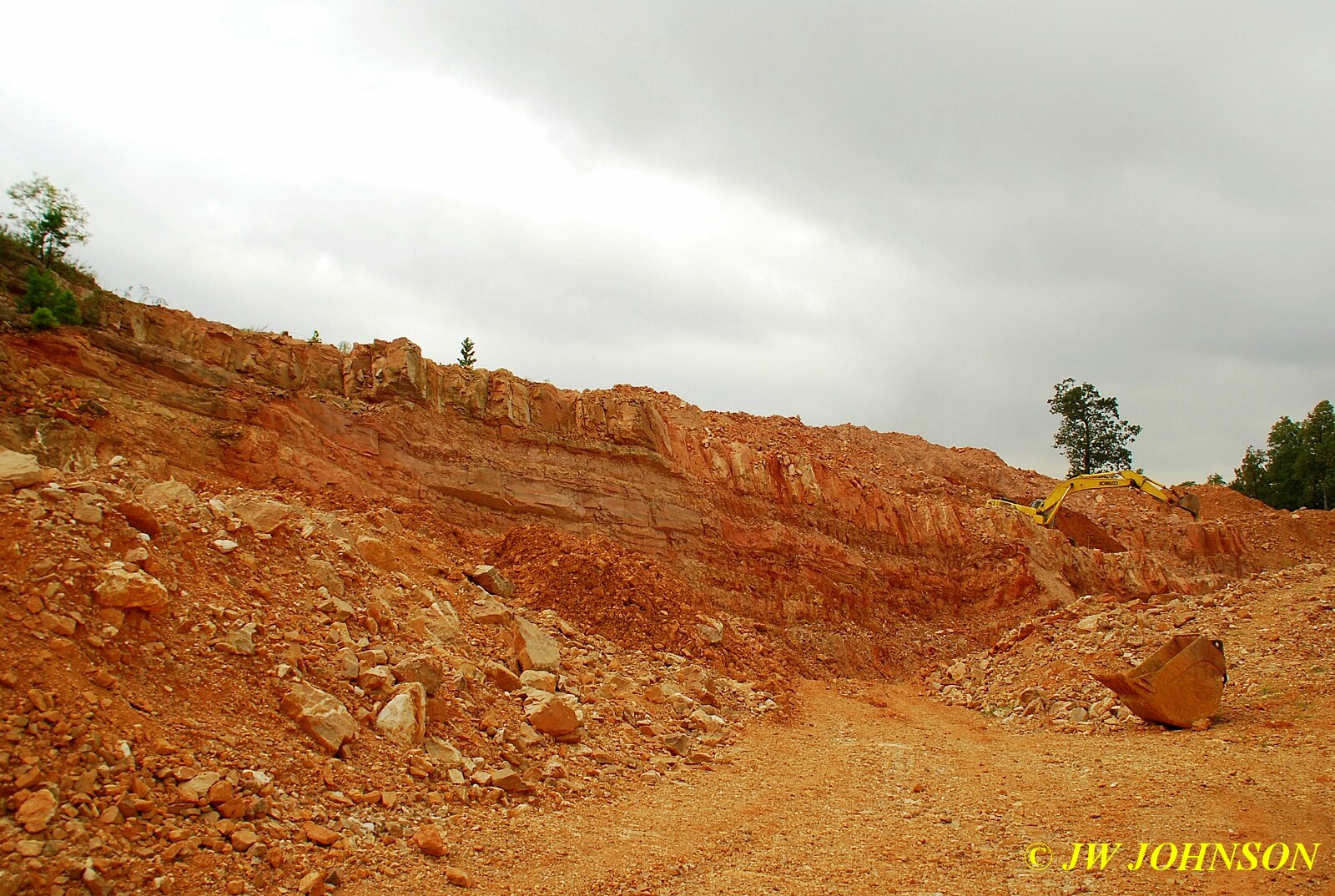 As we arrived at the foot of the hill by the creek, I noticed they have created a parking lot in the field on the east side of the creek bridge, fence enclosed to keep the cows out of your vehicles. I had asked for permission to park on the other side in the shade up by the mine, since I had Missy with me and Ed and Tina had graciously allowed me to do so. Ed and I drove on up to the mine and found Tina`s husband, Brad, up there running the pump to remove the water from the pit. I hadn`t yet seen any photos of the new pit dug a few weeks prior by another rock club, so didn`t know what to expect. I was quite surprised not to see any tailing piles, the ground was completely flat all around the pit and looked to have been tamped down by a bulldozer as well.