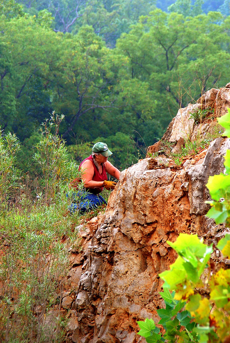 Well we all worked hard and dug hard, and found some nice stuff there, Fred from the McRocks site who I had talked to, was working across from me along the path down into the pit with his friend Shawna, who had just returned from a tour in Afganistan, and his wife who set up working next to me along the west wall….she took my advice and with the use of a pitchfork looking tool, began digging her way to China along the wall in a few places…about an hour after we started digging, Ed called me over to check a bench of fluorite along the vein discovered by Pam and her family, who were also from the Evansville area. Pam is the original rockhound in the family according to her husband and he and two of her sons, Brandon and Clinton, who were along as well and who are both Eagle Scouts, support her and help her with her rock collecting. Sure could have fooled me guys, sure looked like four rockhounds to me, lol. Seems they had discovered part of the bench that we found back in March when Mike Streeter and Jeff Deere reached up under the bench and found a pocket of fluorite cubes. The way the bench looked yesterday though, it would take a lot of hard work to remove the mud that surrounded it to do any further exploring under it. However, they had dug around along the top of it and discovered a pocket inside it from the side, and asked me for my thoughts on removing the cubes inside. I remembered what Mike had told me about hammering crystals out, backing away from what area you wanted to safely remove and chiseling in and trying to form a crack, then using pry bars to wedge into the crack and pry out the piece you wanted, intact. That was the advice I passed on to them and they were able to successfully remove some nice pieces.