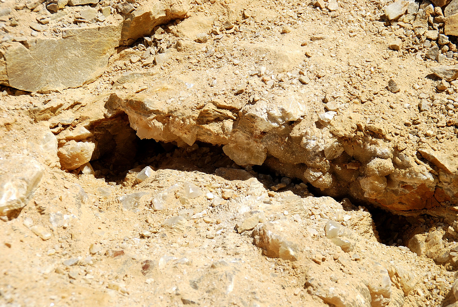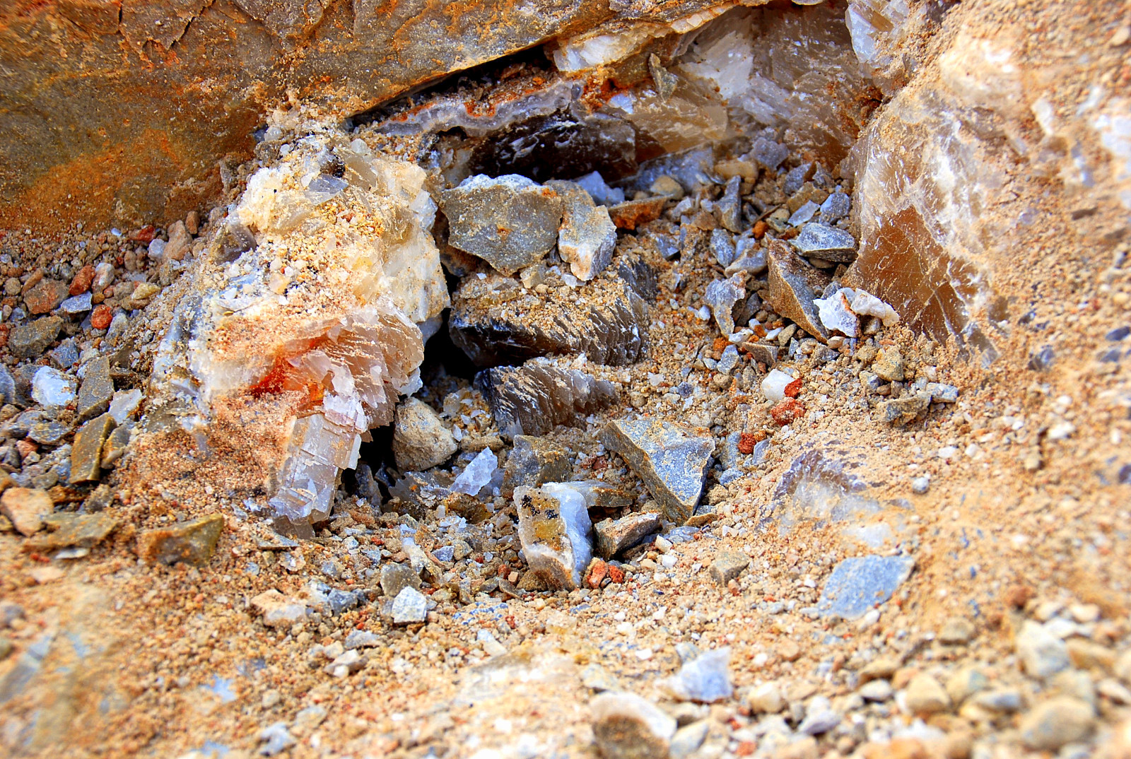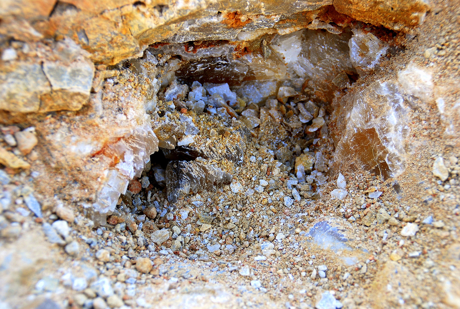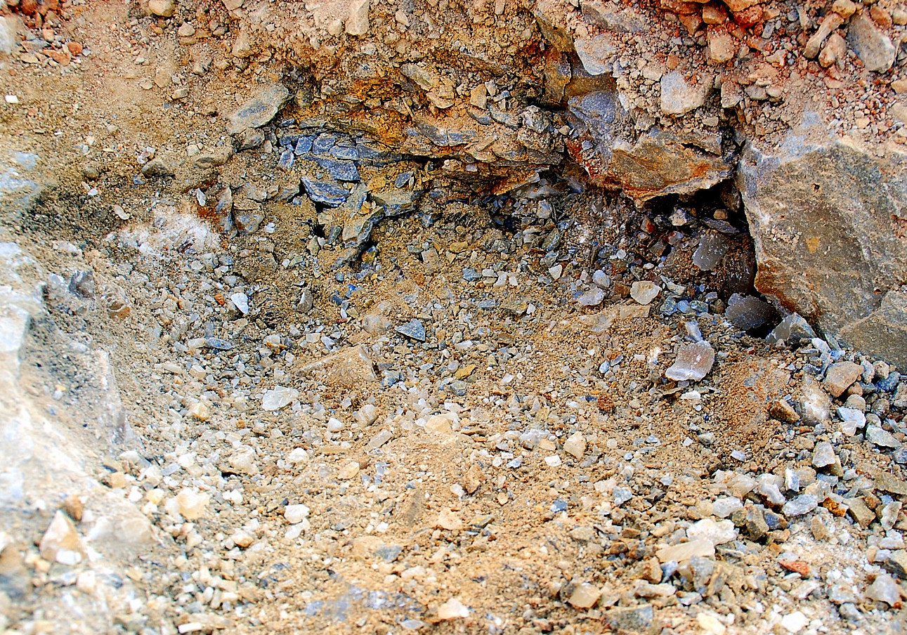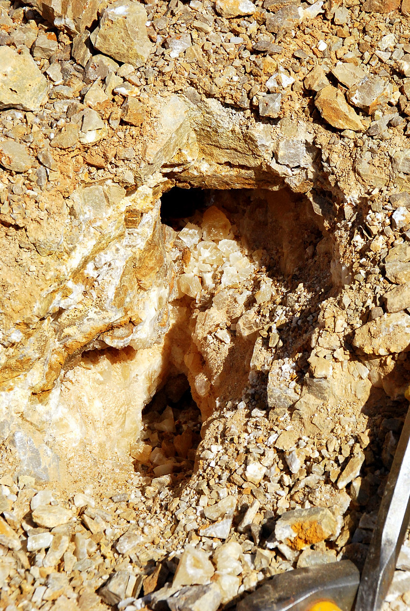 The pocket appeared to be going to my left and behind me somewhat so I followed it and started clearing ahead…I was finding some small plates of druse mostly, wasn`t seeing any crystals to speak of, and pretty soon, the pocket dried up…
