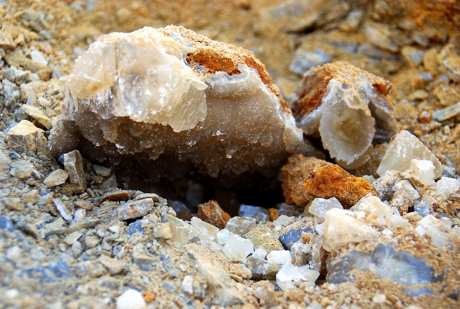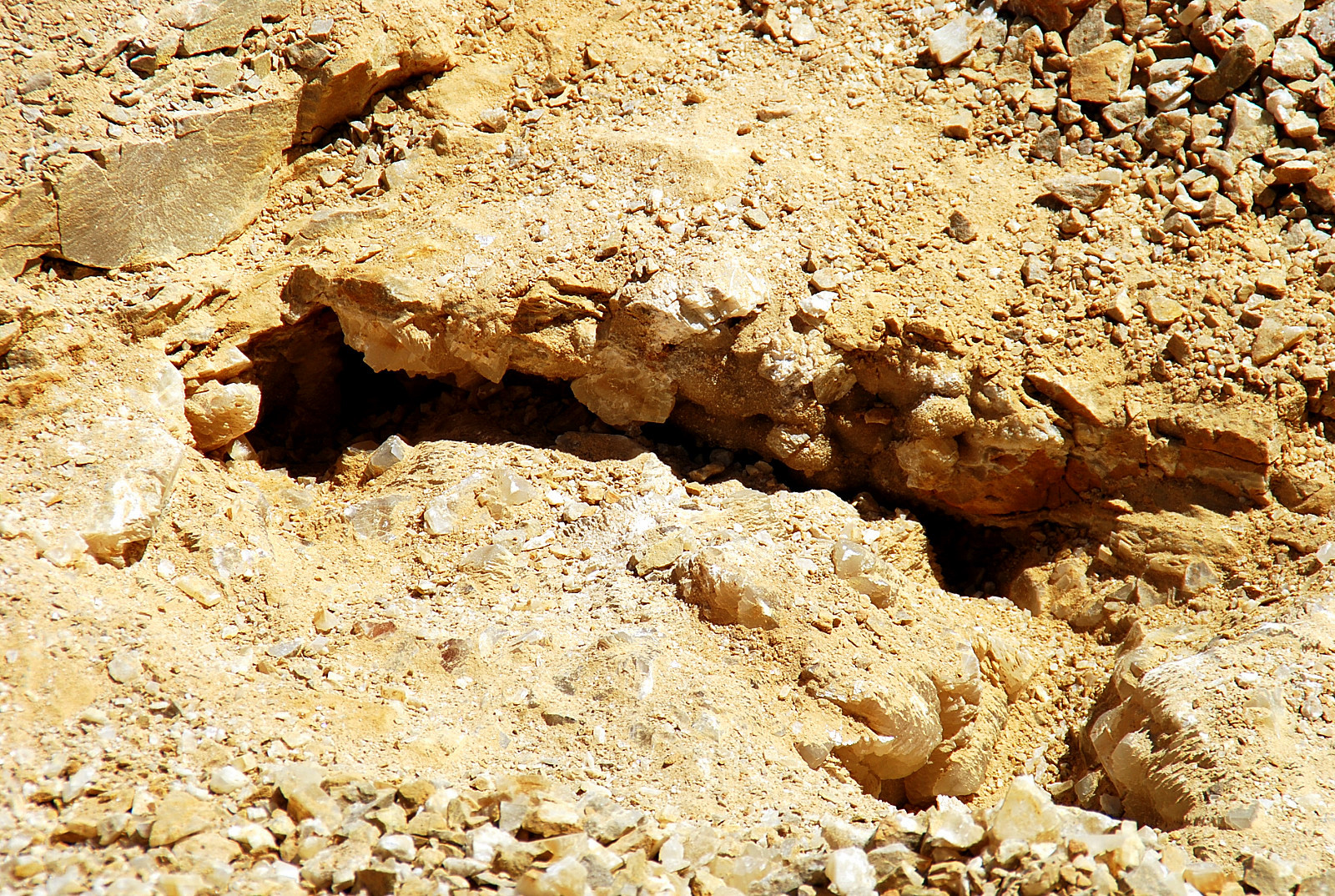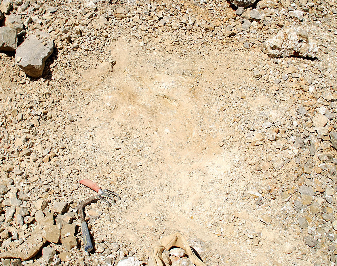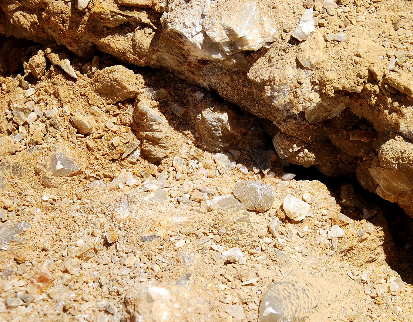 The pocket appeared to be going to my left and behind me somewhat so I followed it and started clearing ahead…I was finding some small plates of druse mostly, wasn`t seeing any crystals to speak of, and pretty soon, the pocket dried up…