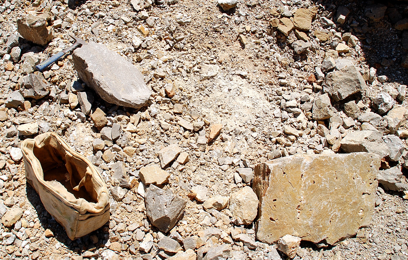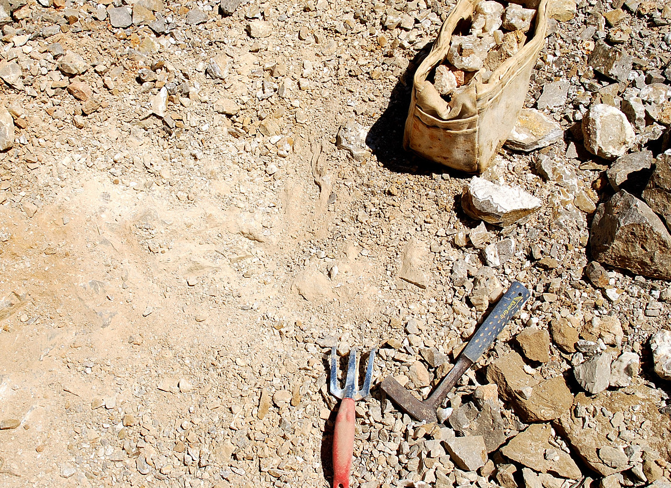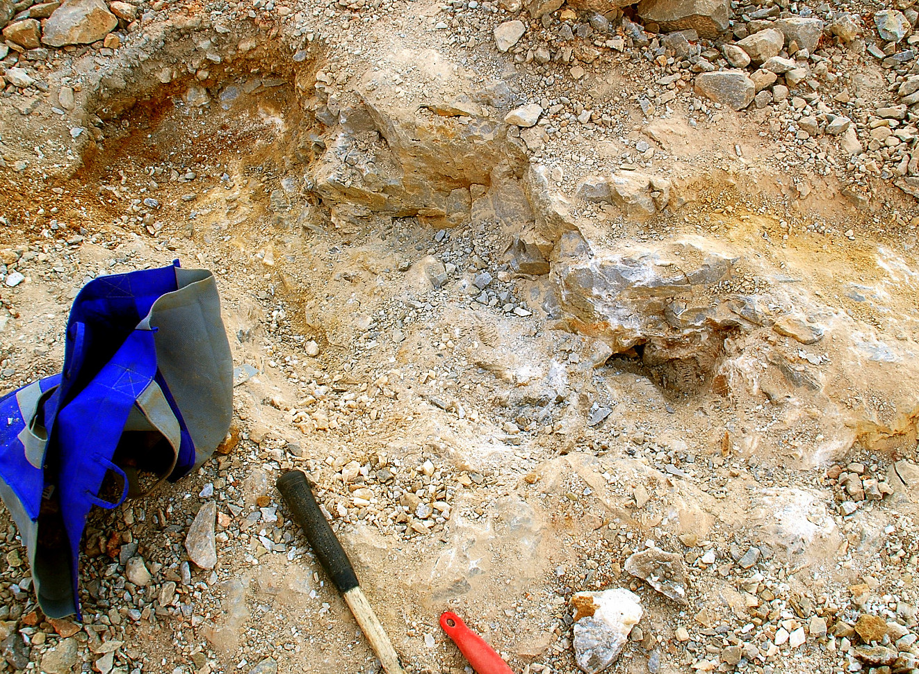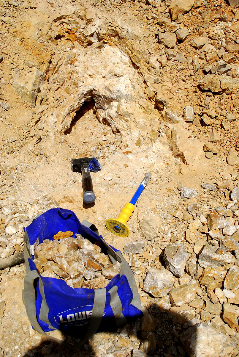 So I started digging down a little bit and if you notice in this pic above, right down from the left bottom corner of the white canvas bag, there is a little ridge of rock there, or shelf, and that was where this pocket actually started, I started finding loose crystals and plates in this area right way…