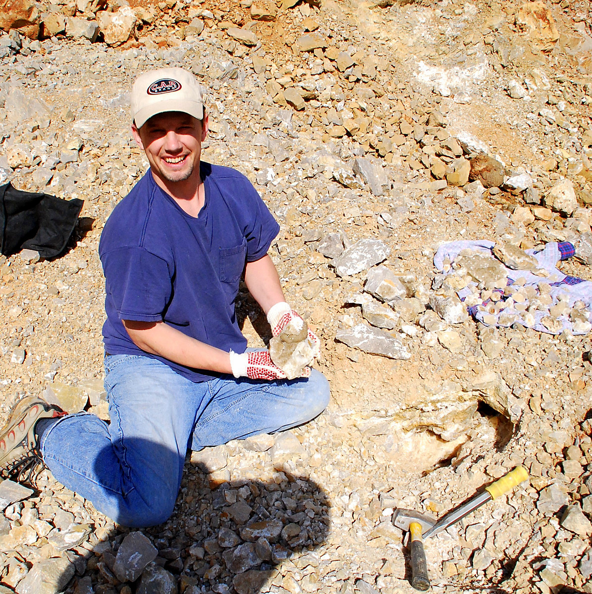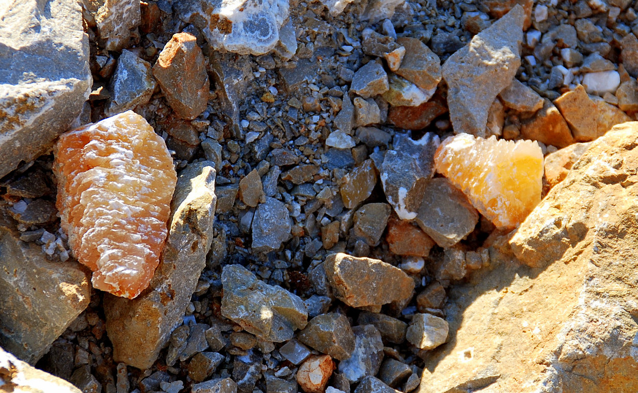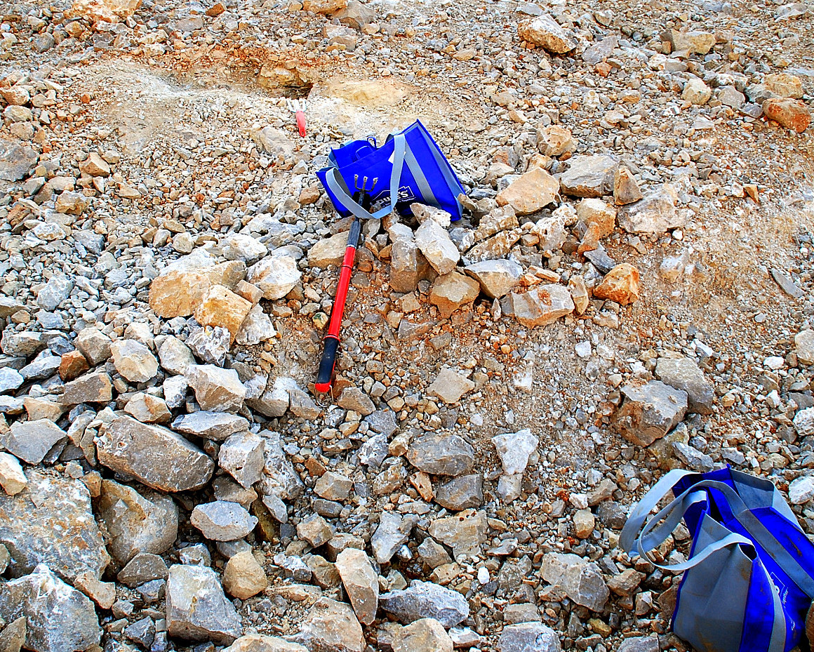 I walked over to the pocket where I had found the bubbly druse plates and as I knelt down to take a closer look at a few pieces I had left behind, I spotted a few poker chips poking up out of the rocks and dirt about three feet away. I crawled over and brushed the loose ones away and found a few embedded in the dirt. I started clearing back the big gray rocks that surrounded the poker chips and digging down.