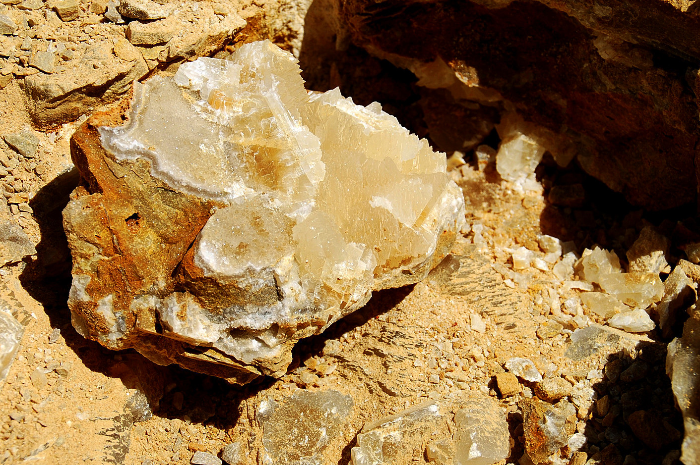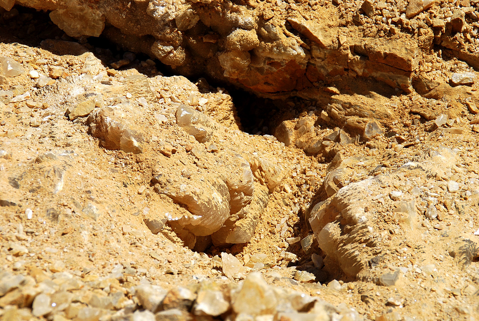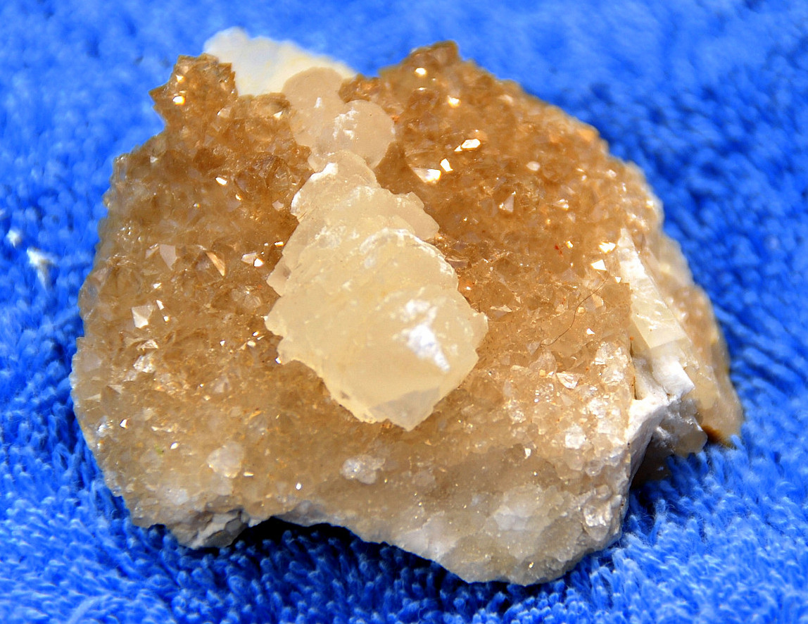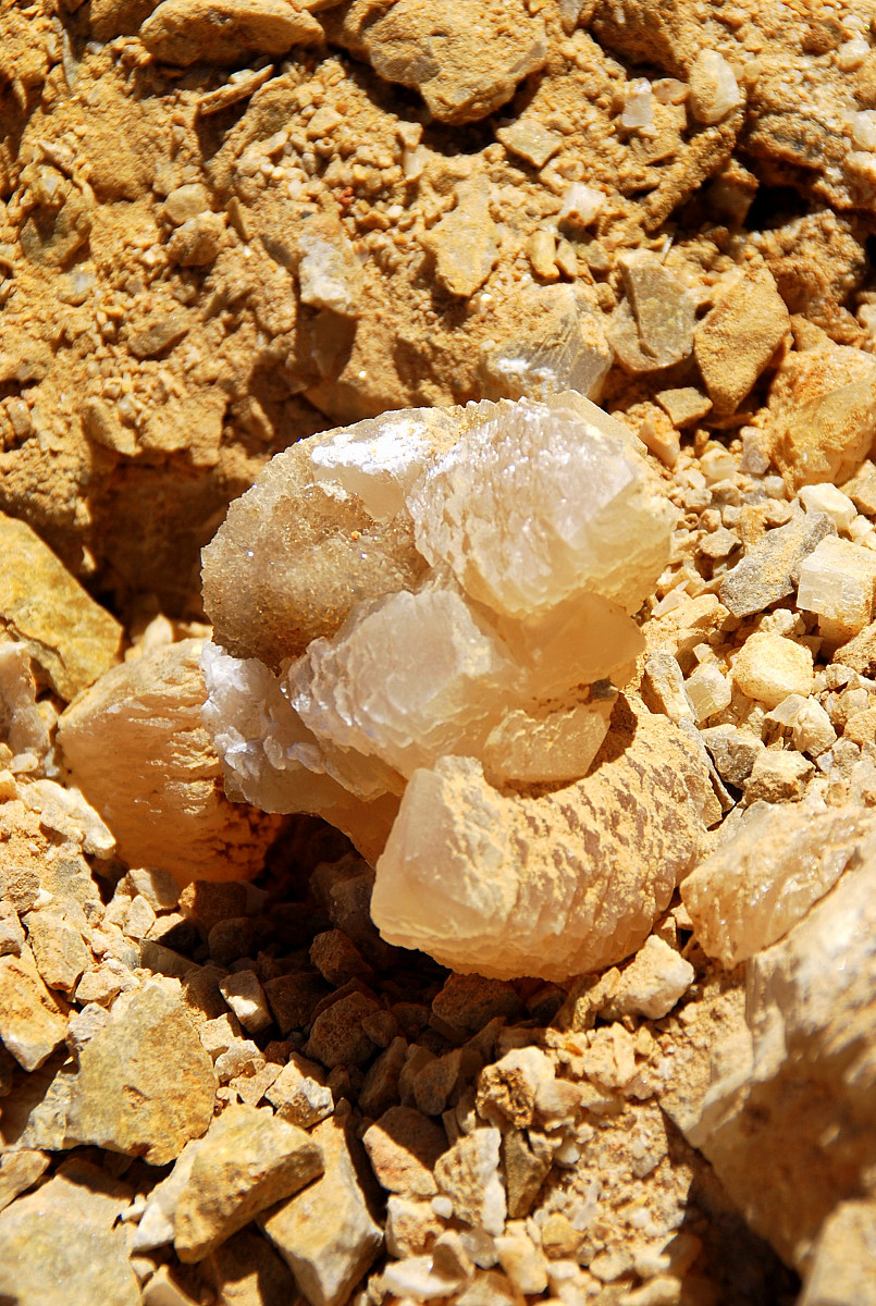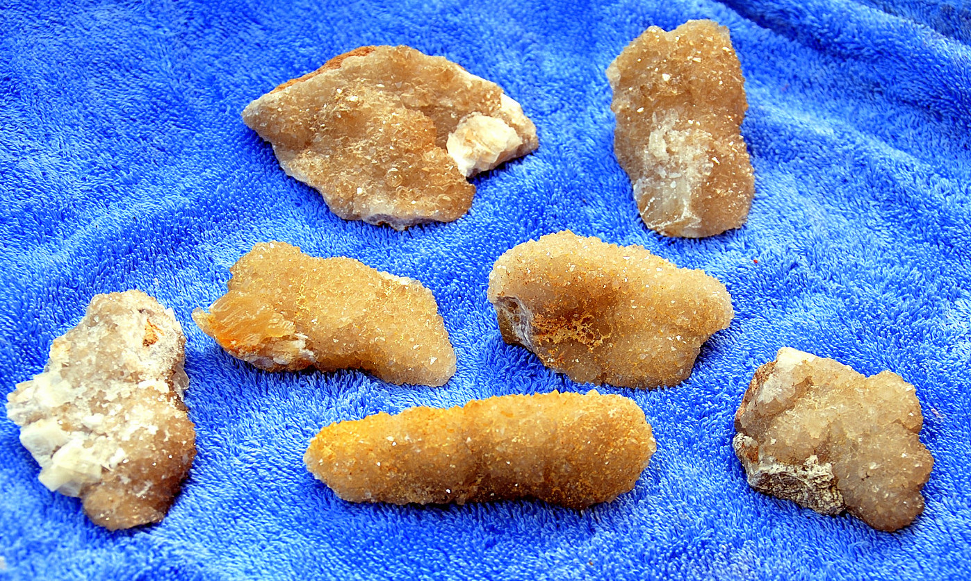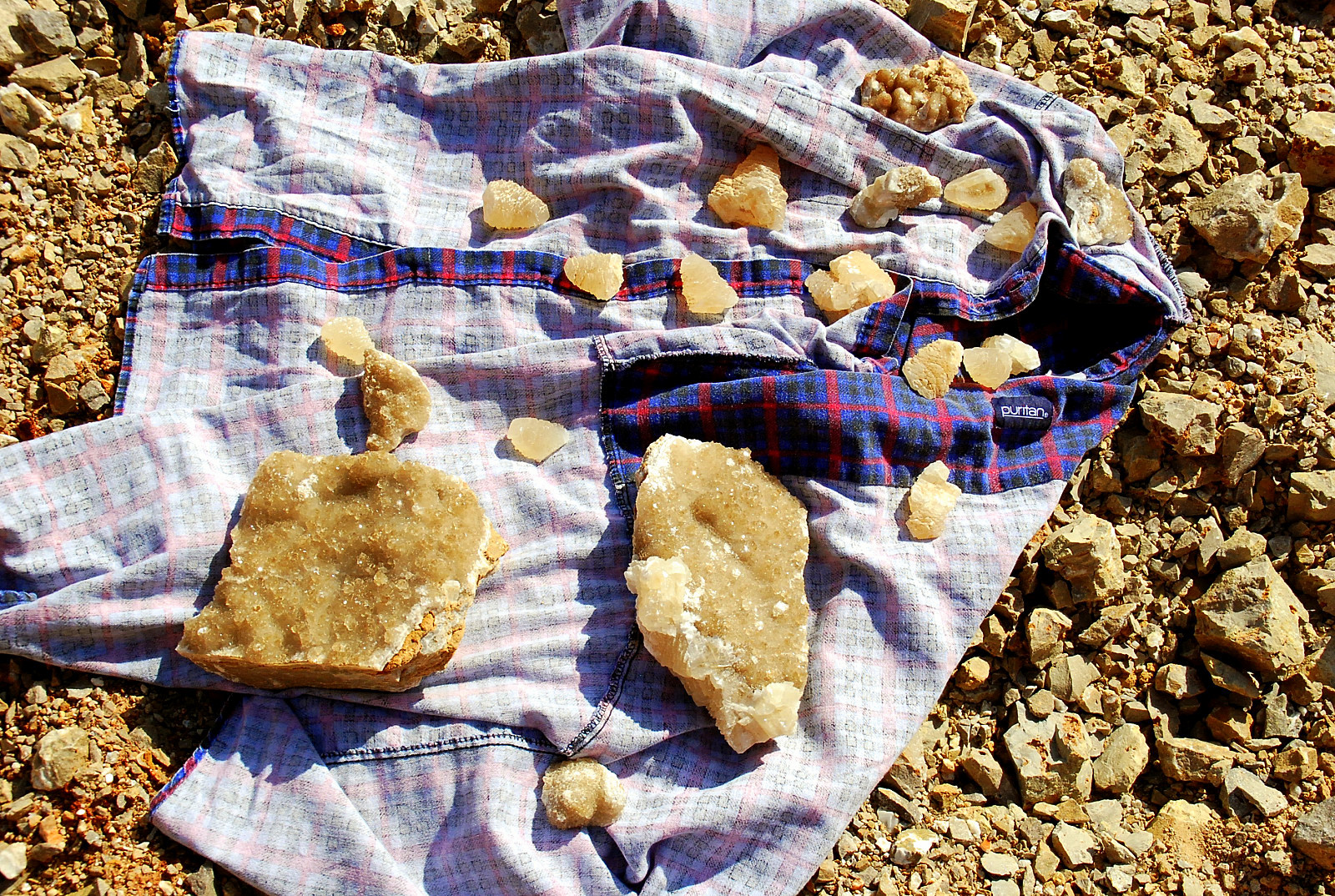 In the area to the left of the bag, I started finding alot of loose crystals again, some that had that honey brown color to them and some little twins and triples too…and some druse crystal plates with poker chips attached to them…and then I saw some large embedded clusters, embedded into the rock below…I was dumbfounded…