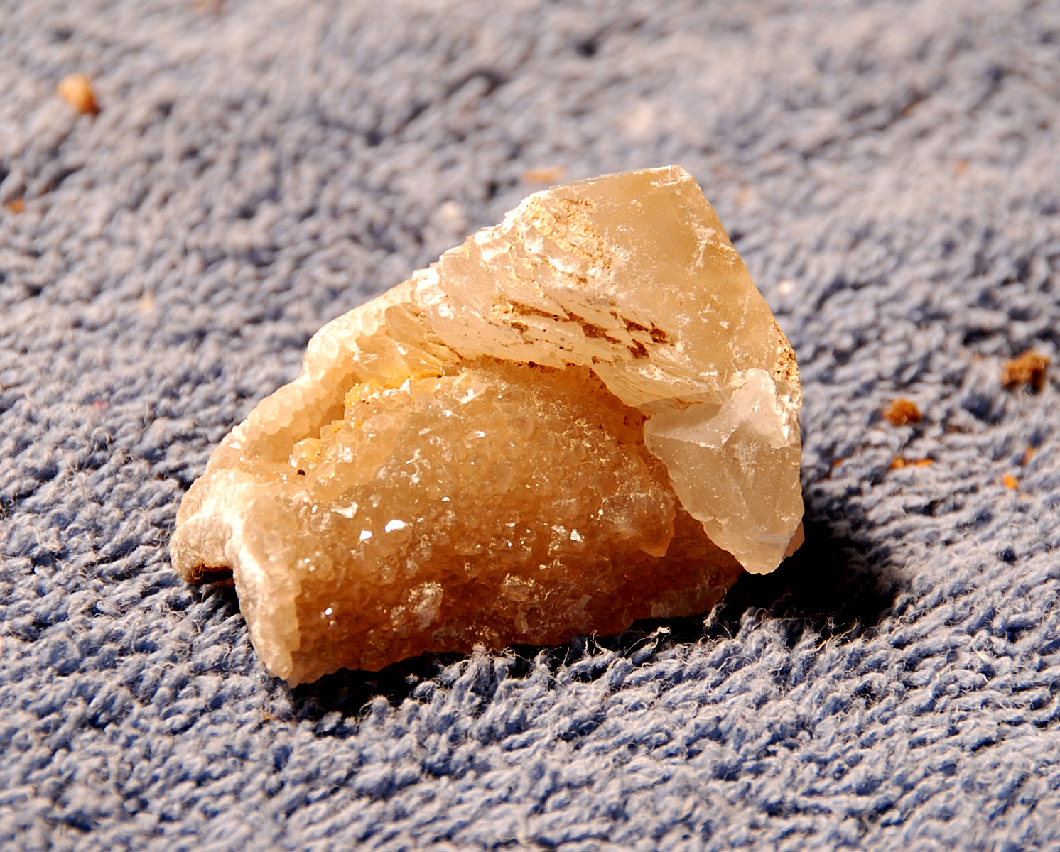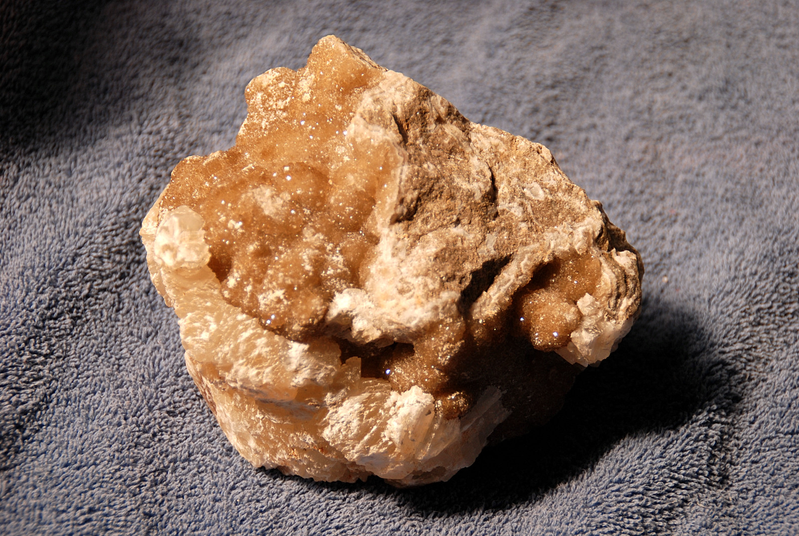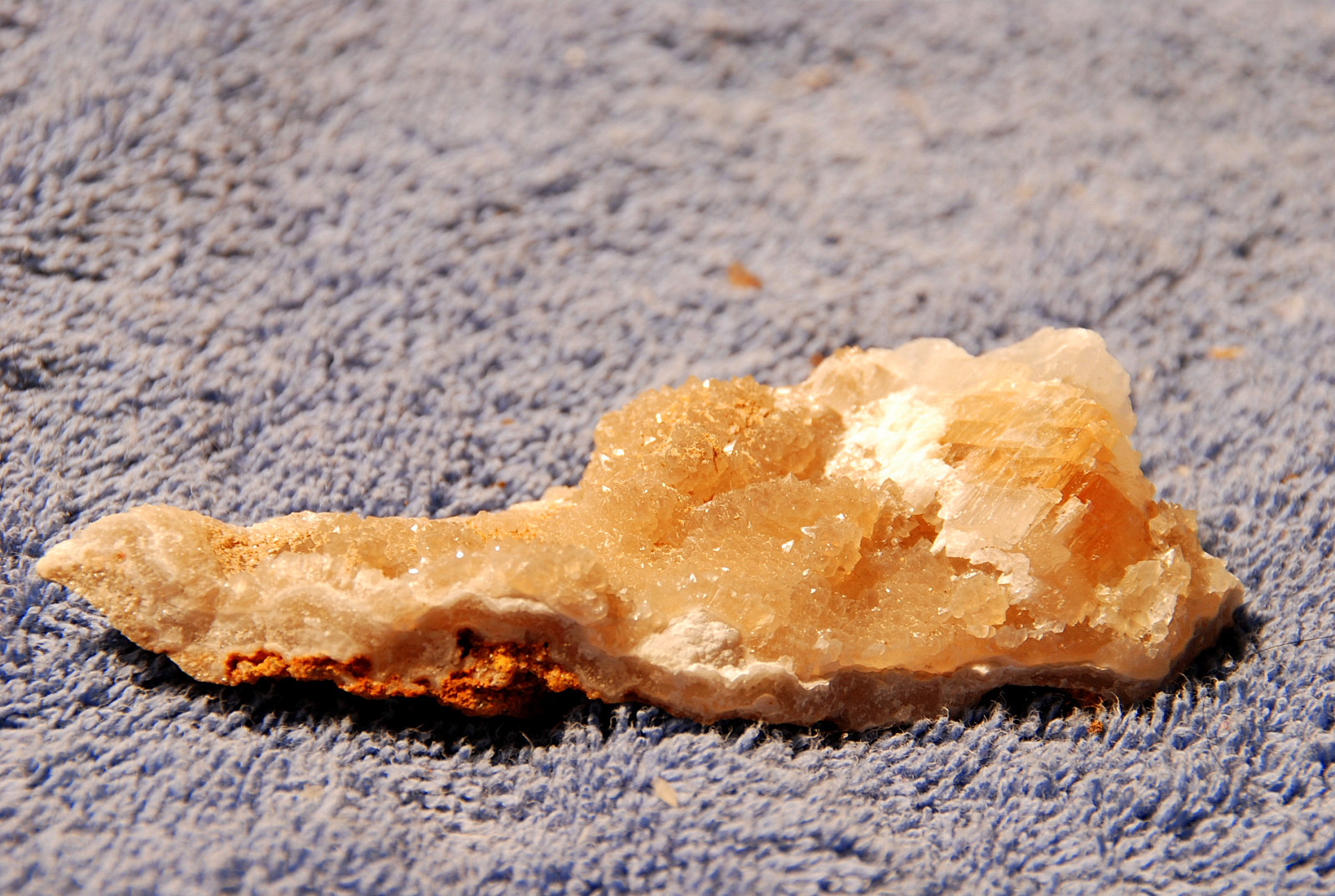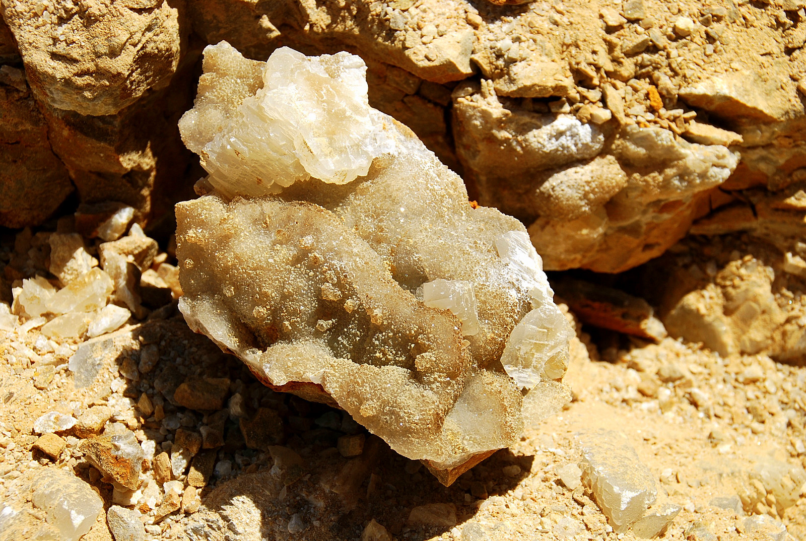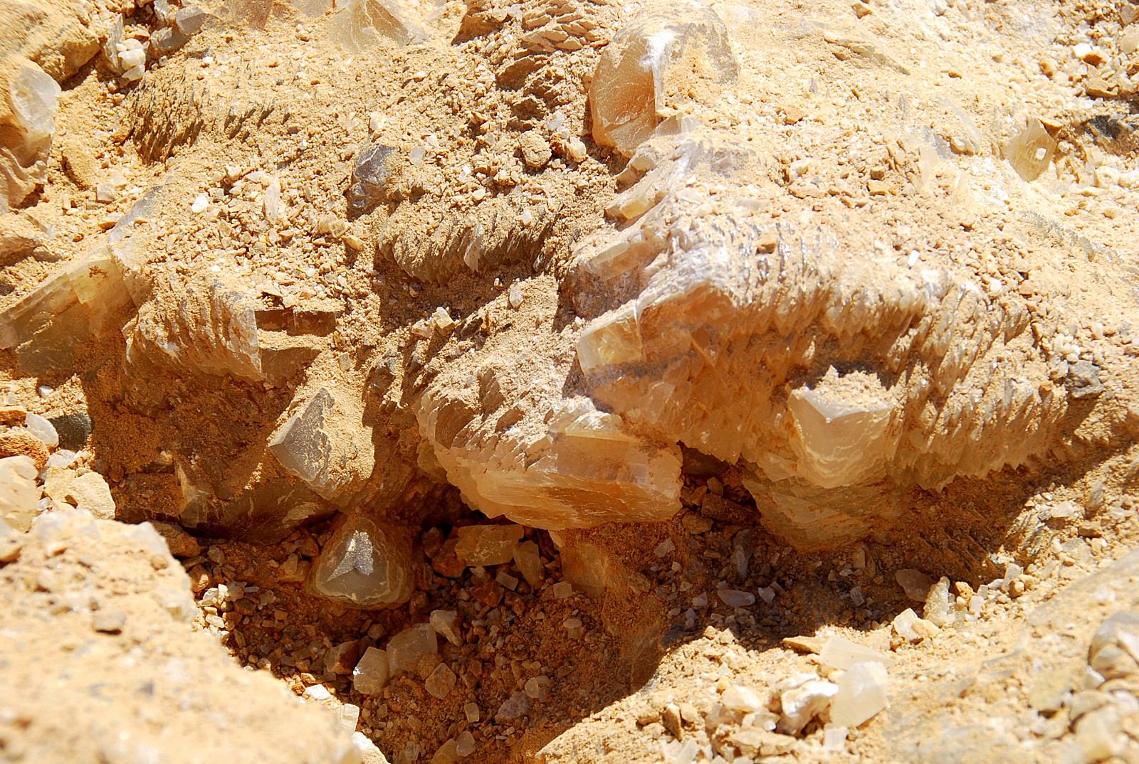 In the area to the left of the bag, I started finding alot of loose crystals again, some that had that honey brown color to them and some little twins and triples too…and some druse crystal plates with poker chips attached to them…and then I saw some large embedded clusters, embedded into the rock below…I was dumbfounded…
