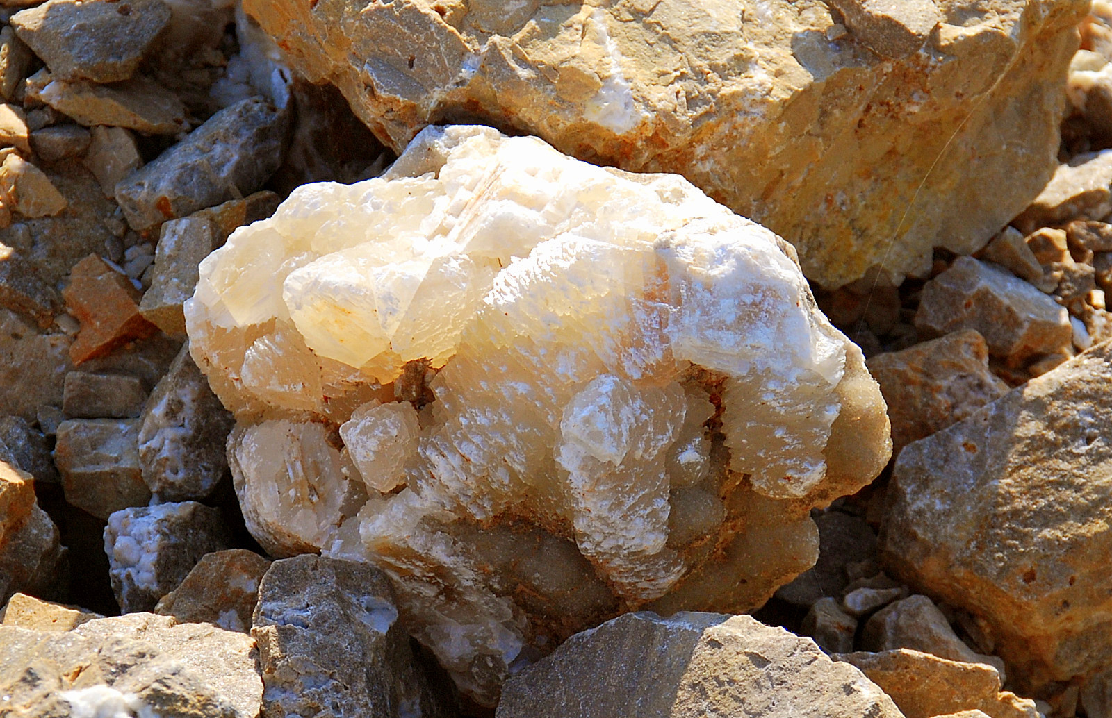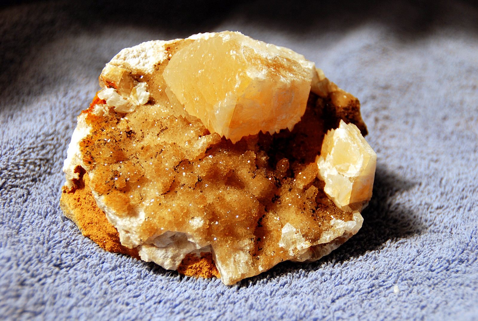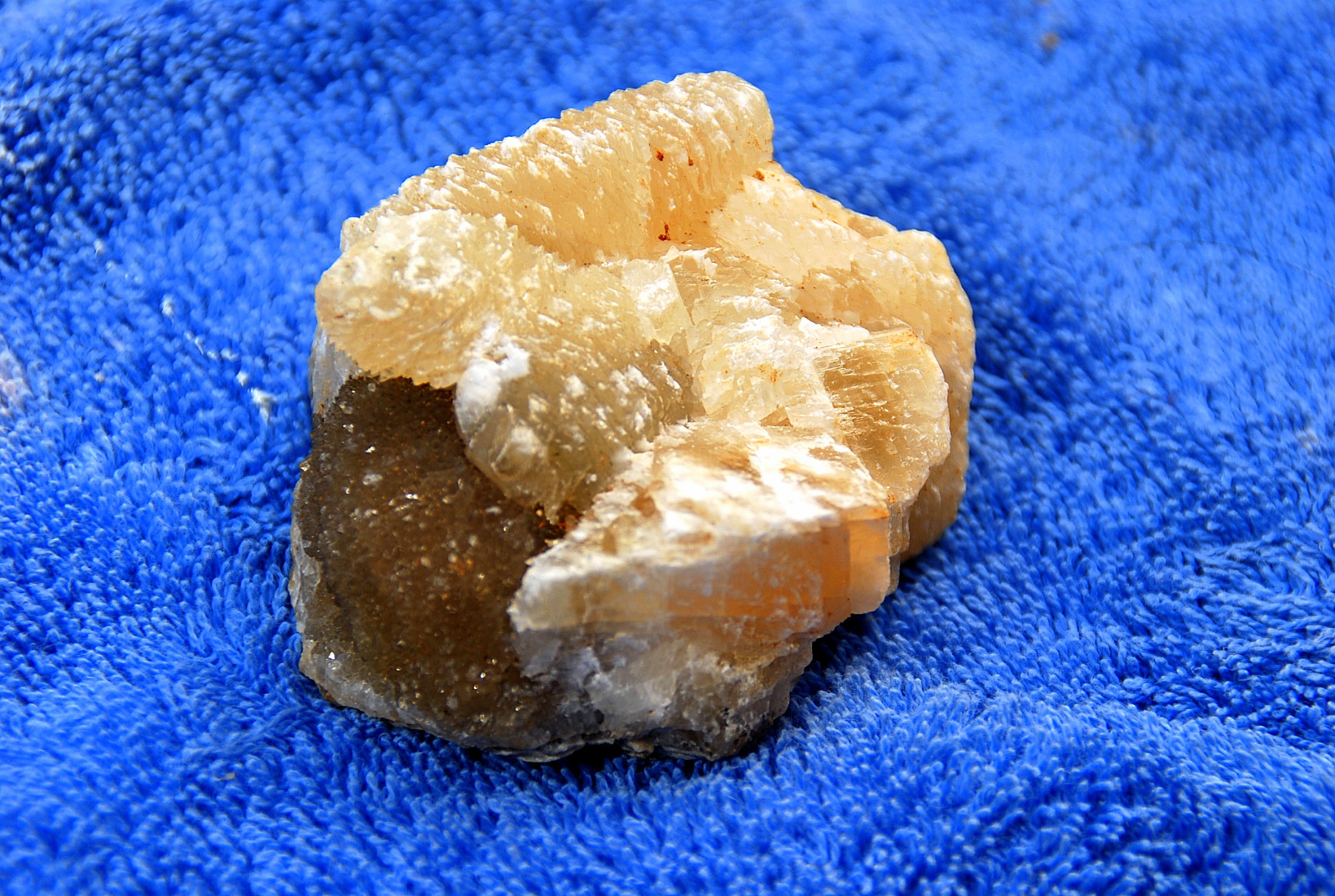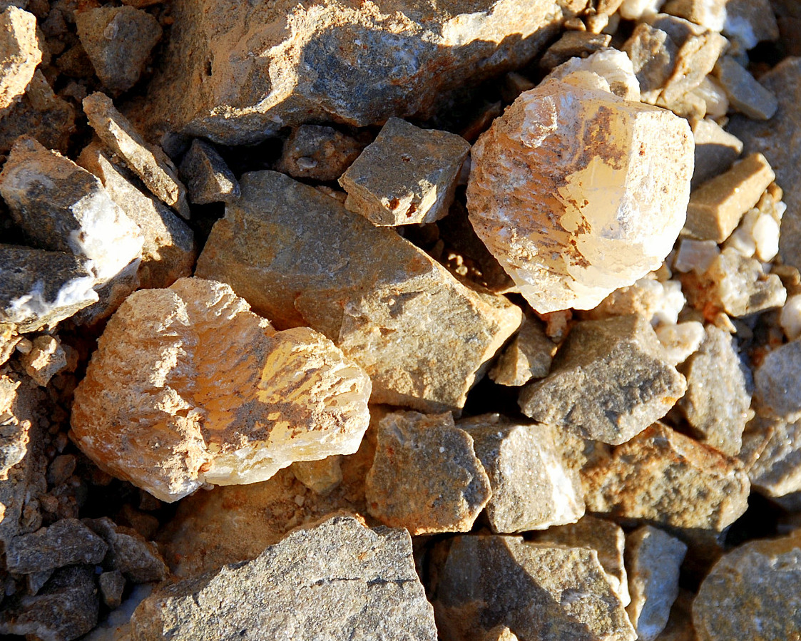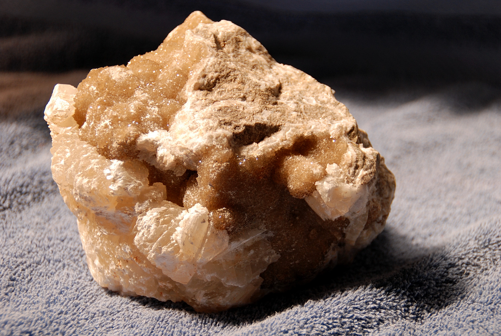 In the area to the left of the bag, I started finding alot of loose crystals again, some that had that honey brown color to them and some little twins and triples too…and some druse crystal plates with poker chips attached to them…and then I saw some large embedded clusters, embedded into the rock below…I was dumbfounded…