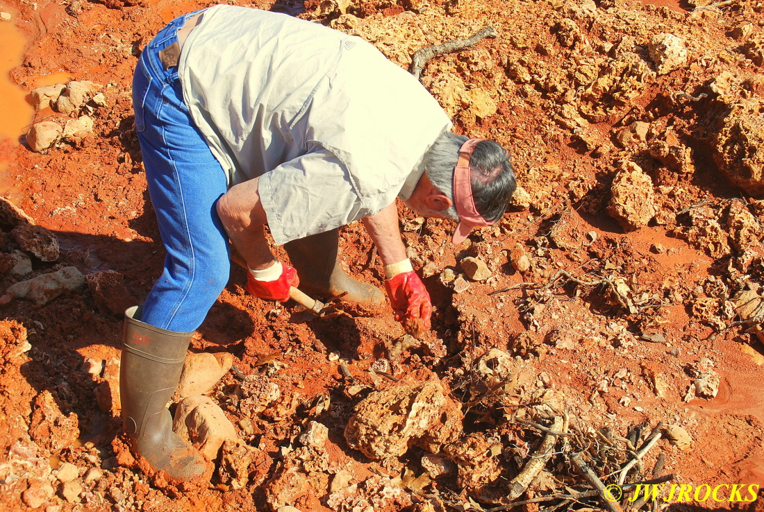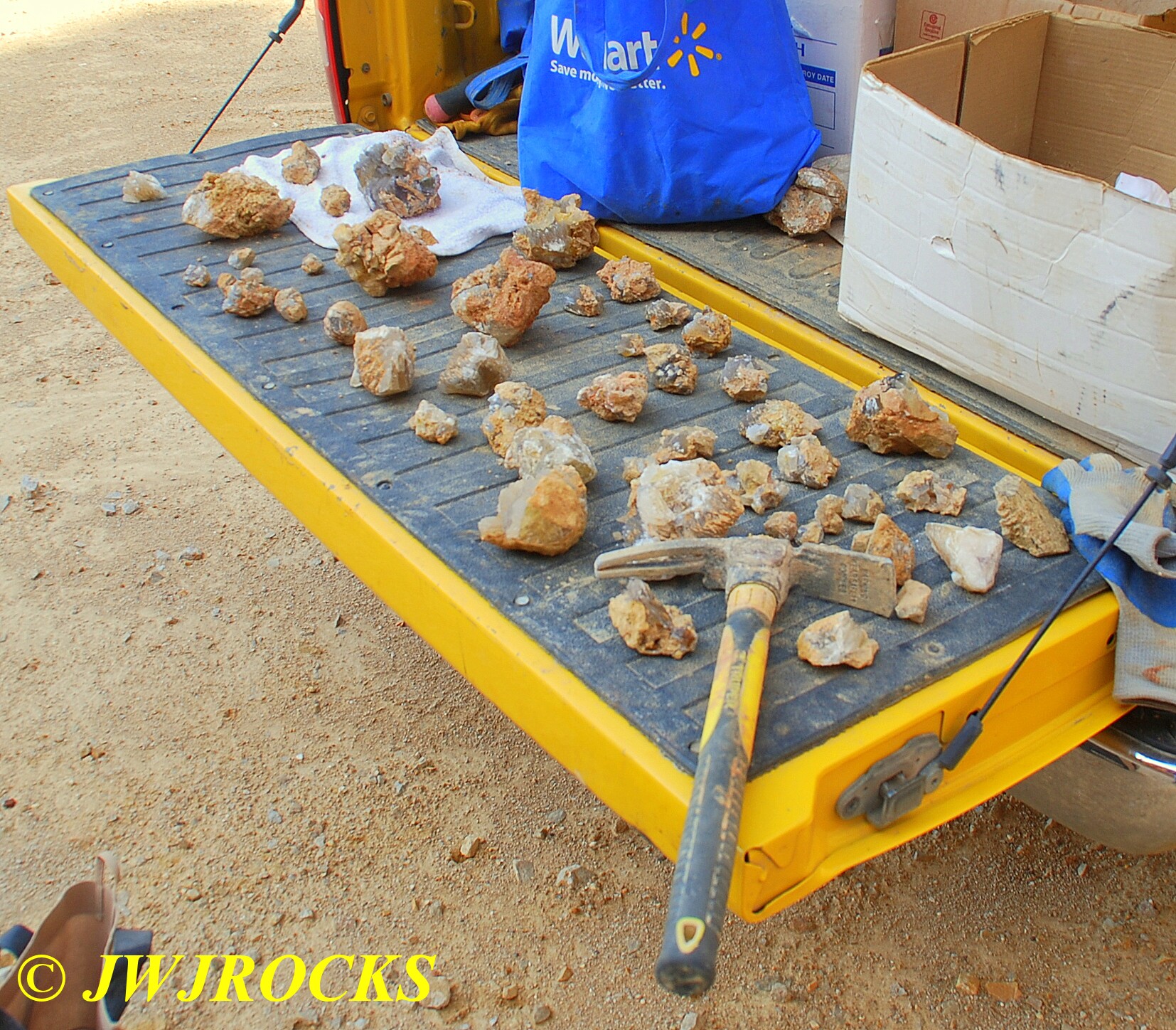 you can see the outline of one of the washes in the photo above, about middle of the photo…it runs left to right across the photo, that is the main wash with all the soda straw plates in it. Everyone started collecting over there that morning, it was a little muddy and thankfully, many wore their rubber boots or they might still be there stuck knee deep in the muck. It rained the night before and it was a bit gooey but much easier to pull stuff out of it, too. I got tickled at my retired firefighter friend Gary, who didn`t take a bucket out there with him, so he just piled his finds up on the rear bumper of his truck instead….
