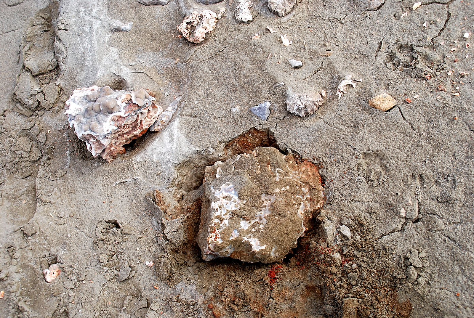 We started looking around both sides of the dam road, checking out the washed out areas first and found some nice plates of druse and quickly filled two bags with it. Kaye couldnt go today, was helping take a friend to the doctors office, so she had asked me to find her a nice druse plate or two. Believe me, I was turning several over looking for some, found a few nice smaller ones and then all of a sudden, turned one over at the base of the hill….