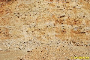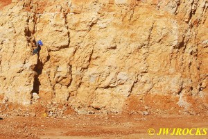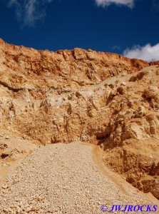 ….after walking around and not finding much along the wall…it was also obvious that there were many pockets way up high from all the glittering I could see where the sun was hitting the wall high up, but I found no pockets down below at all. I decided to walk down the wall to the east and see what I could find, checking along the base where much of the ground material had been scooped up and removed as well, since my last visit. I soon came upon a section of the wall where there were some apparent crystal formations….