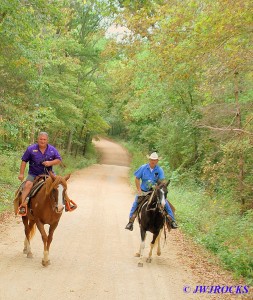 …and we soon were up on the main road, on our way to the back side of the farm where more pretty trails awaited our arrival…here you see Ray and Jerry bringing up the rear of the trail ride….