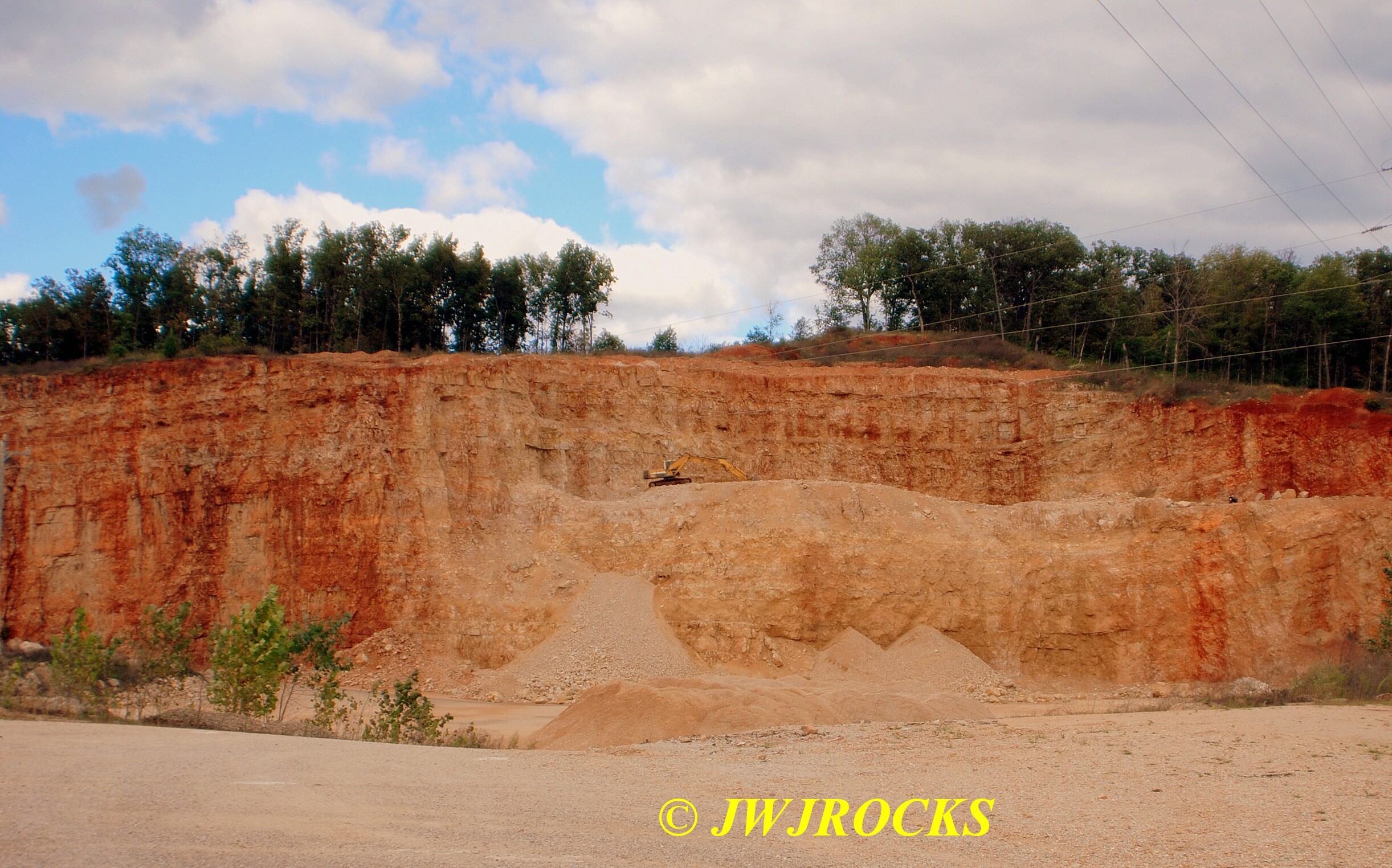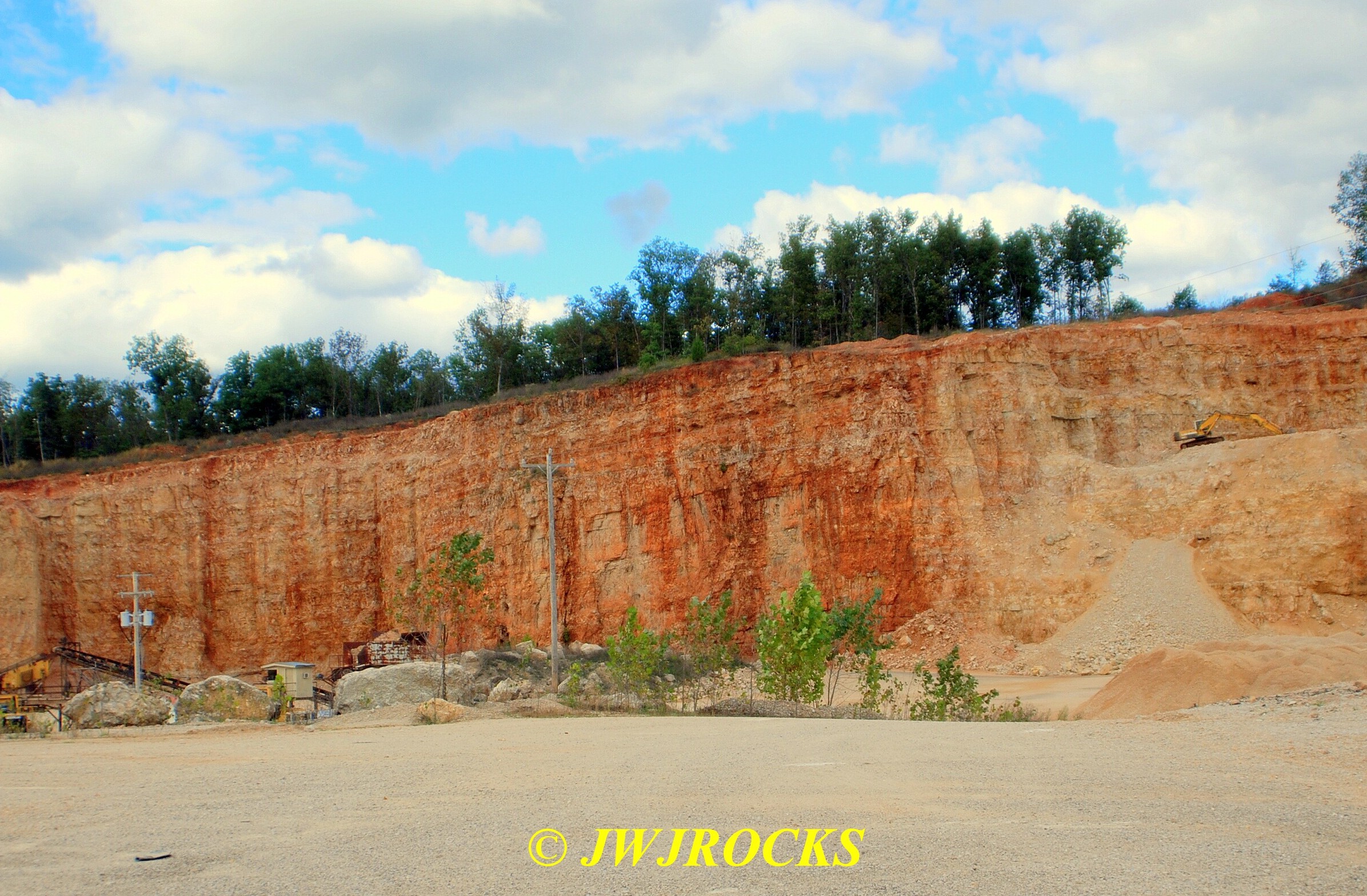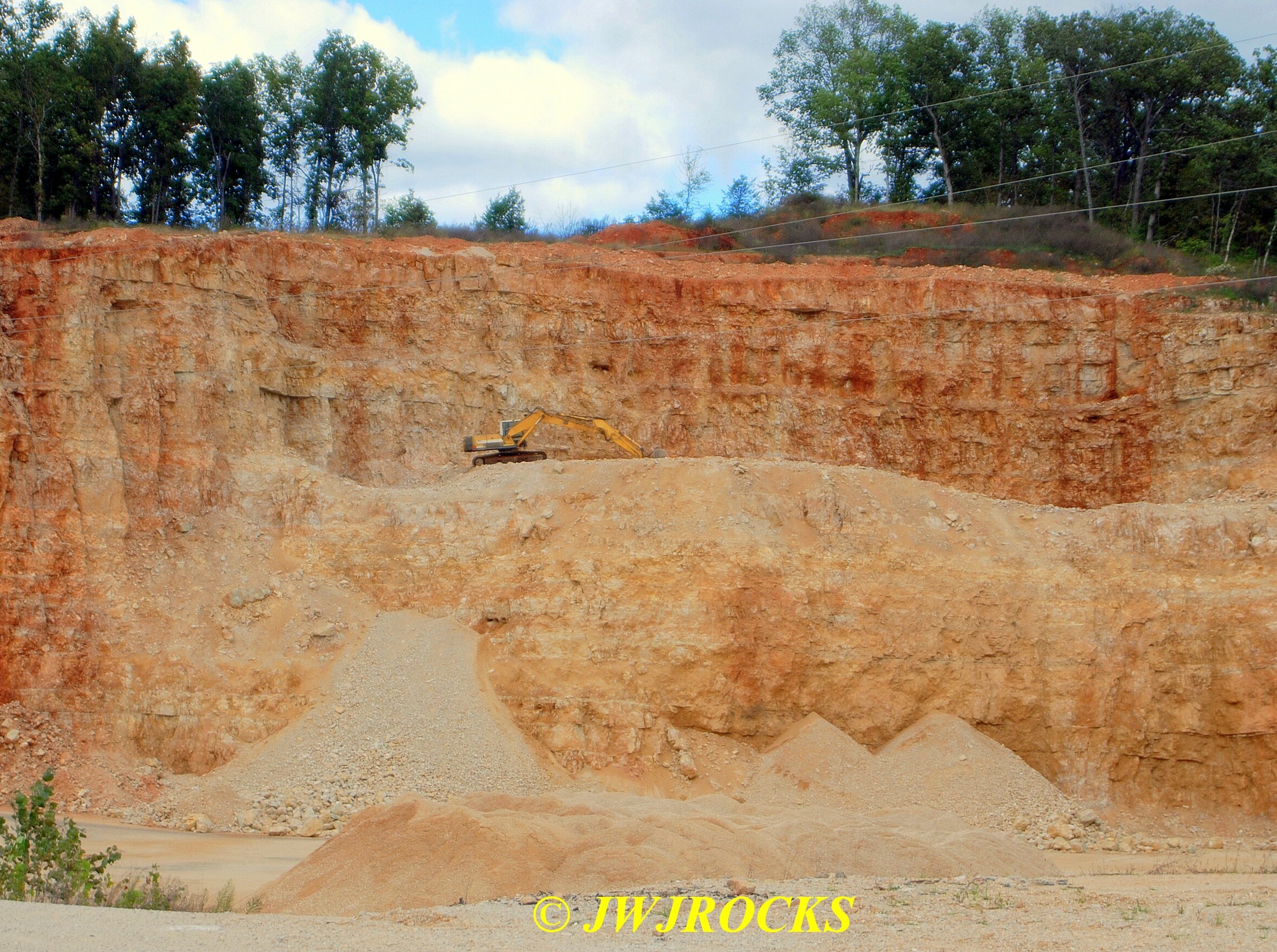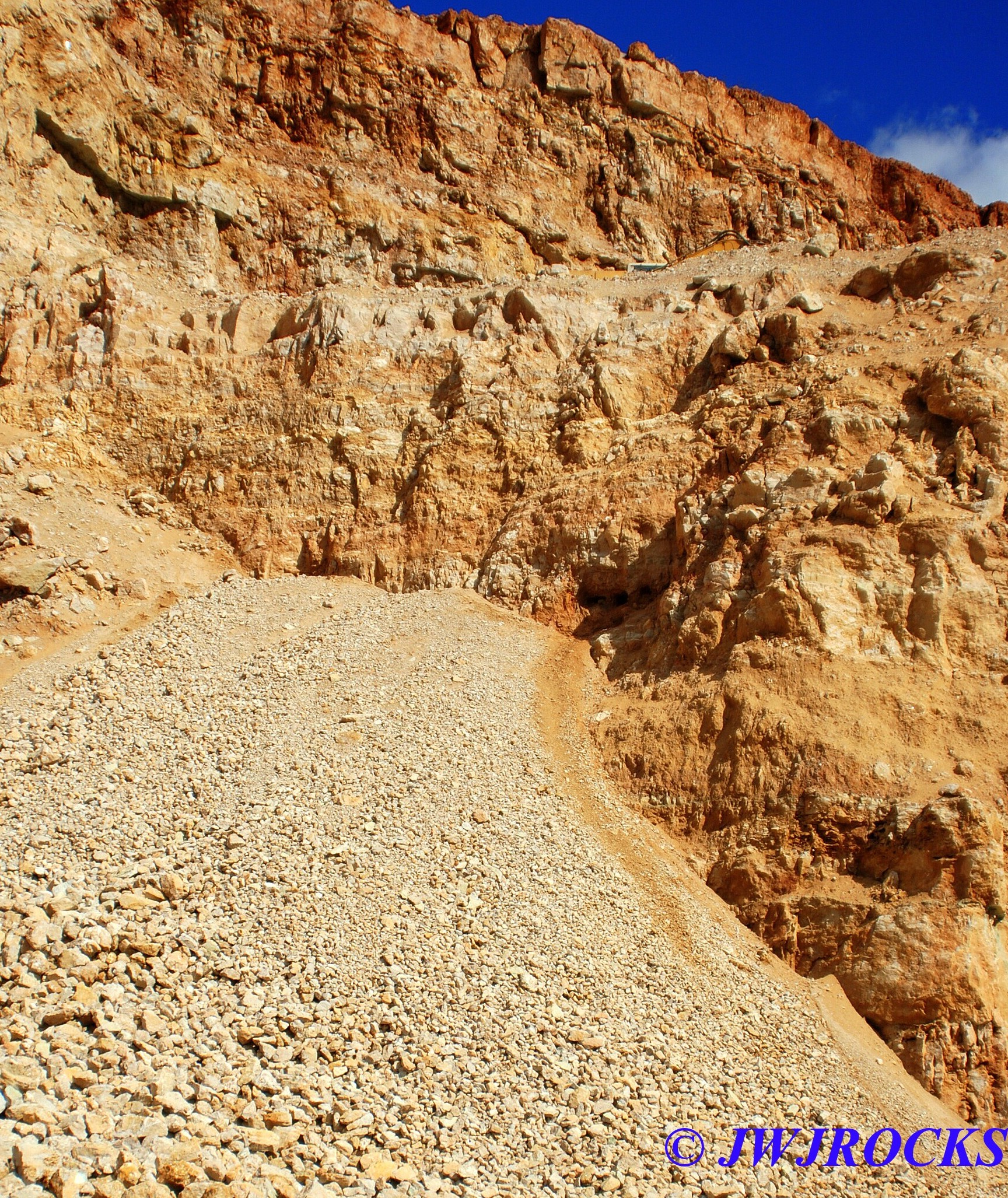 Missy had trotted off in that direction already, so I loaded up and drove on over to that pile next. I had seen a trackhoe up on the upper bench on the south end when we drove into the quarry and it appeared that the hoe was pulling material off the upper bench and pushing it over the edge and down below…..