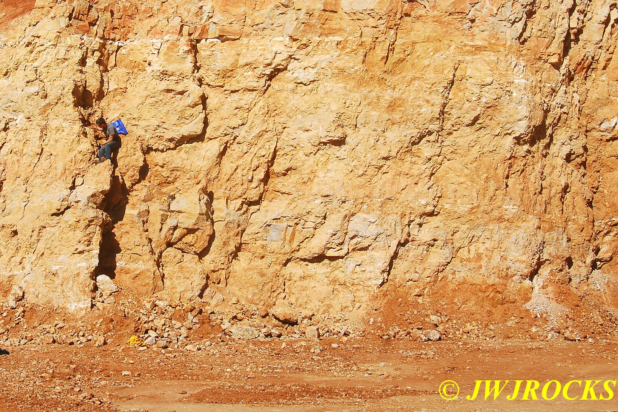……now just a few piles of rocks left at the bottom of the wall…we checked the piles first and found a few remnants of clusters, then checked the wall pockets and St Louis Ray spotted a pretty crystal cluster sitting about ten feet up in situ matrix…and was able to climb up and retrieve it without any problem. For the next couple of hours, we scraped along the wall and found a few pockets of small clusters….