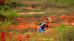 …he had his boots on when we arrived, so he took off and started walking and searching for crystals before grabbing a bag or anything to put them in….he was too excited to even grab his gloves or tools…as you can see, he made do with his shirt tail when he started finding them up there…..like a kid in a candy store believe me…..