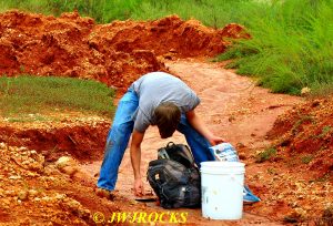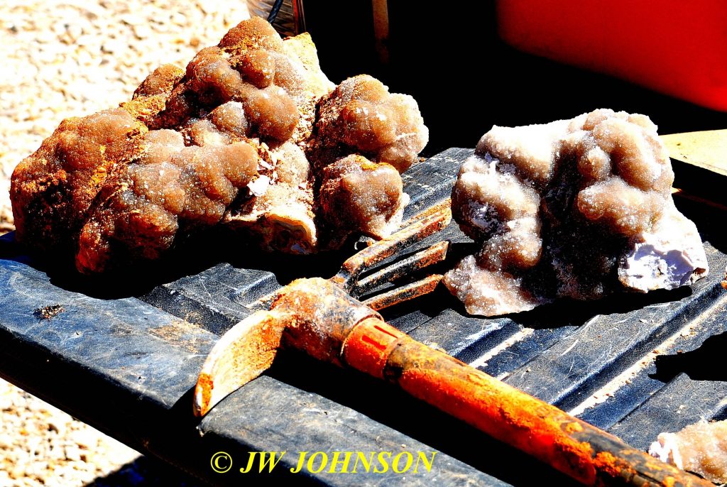 The next day we drove down to the druse spot…..we didn`t get an early start, slept in a bit as we were wore out from the day before. I had told Justin all about this location, assured him he would have no problem finding some nice stuff to take home, depending on what colors he liked in druse quartz…I think he was a bit skeptical of me…but within about five minutes of arriving, all that skepticism went right out the window. Onyx and I were up on the hill above him and we could hear him talking about it…sometimes to me…sometimes to Onyx…and sometimes I think, to himself…I even captured it on video…