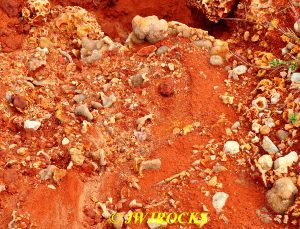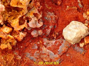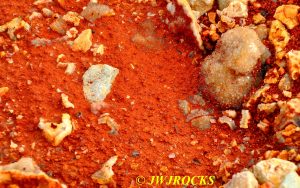 …from there, I ventured over to the left along the main wall and decided to walk over to the left hand wall corner, to see if I could find anything worth taking home or a new pocket…that is a very vuggy area sometimes but requires a closer inspection because it can also be unstable looking from afar. As I approached it, I started seeing poker chips laying on the ground under a large rock sticking out from the wall about six inches…I kneeled down to take a closer look and discovered a very large area of poker chips spilling out of yet another pocket opening up under that ledge of rock…flabbergasted would be an understatement for me. For one thing, standing where I parked, and looking over to that corner, you could not see anything due to a large pile of rock blocking your view from there..I literally had to walk over to it to see it, but then again, this was going to turn out to be yet another huge pocket and the last few weeks had been several huge pockets, one after another, so flabbergasted was very appropriate. 🙂 I do not have any photos of that pocket from the get go nor to the finish, but I can show you what the initial finds were that I pulled from it ….