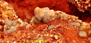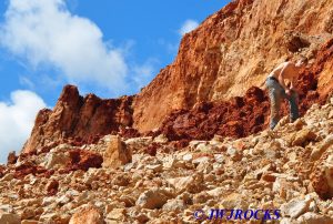 …notice the druse on the left side in and around those big rocks on the left side ? make note of that and in a few minutes, those will be come clear to you as well as it was to me….I climbed up on that debris pile after setting a few pieces of the dolomite up there to stabilize my footing, and then began to dissect the opening of the pocket…