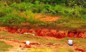 Abbi and I started taking a look at the pockets along the base of the far wall on the other side of the big water hole and I told her to check out the bigger pocket that I had worked at the end of the day before, and take home some of those big bubbly druse clusters that resembled the grape agate clusters you see for sale from Indonesia…the gray in the pocket resembled the purple color of the grape agate. While she was checking out that pocket, I was working the pocket where the yellow rain jacket is sitting to her right…it was raining when we arrived so we wore our rain gear for maybe ten minutes… then it became so humid we had to take it off…I left my camera in the truck due to the rain…