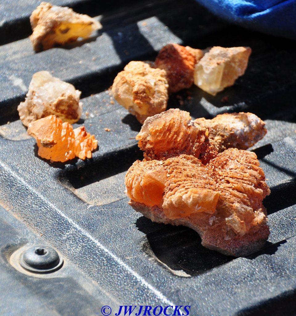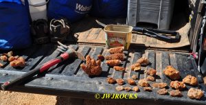 …and I remember walking over to the right side wall to re-check the big pocket in the wall that I found two weeks before when Abbi came to visit, to see if I missed anything….and discovered that either Abbi or I had failed to remove a couple of small clusters from the rocky floor below the pocket…so I put those in my bucket and then climbed up to peer inside the pocket again, pulled out a few smaller crystals and a few baseball sized clusters, then grabbed ahold of some crystals in the bottom, midway back in the pocket floor…low and behold, they moved…the cluster was loose, so I was able to pull it free from the floor of the pocket !! and here it is on my tailgate a few min later surrounded by some of the loose smaller ones I pulled free….