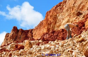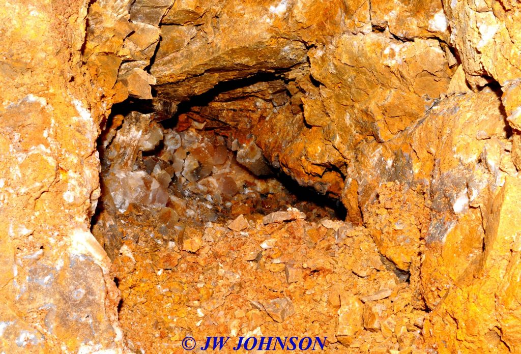 …let me rephrase that…this beautiful cluster…and since I am in the habit of looking around when I find something this nice in amongst a lot of ugly rock, I did exactly that, made a 360 degree turn and look movement, and immediately spotted two more large clusters like this as well as multiple single crystals and some twins and triples too…EUREKA !!!! I looked around for Abbi and spotted her heading my way but slowly and surely, but once there, she didn`t stay long, as her stomach was not doing well so she headed for the nearest bathroom spot. She left me her bucket and I began to fill it with many crystals just in case. I looked up on the wall above the area of crystal filled debris and spotted what looked like a potential pocket to me…top of the next photo where the hole in the wall is located…sure looked like a pocket to me…and crystals outside it and just below it really just cemented the idea for me…