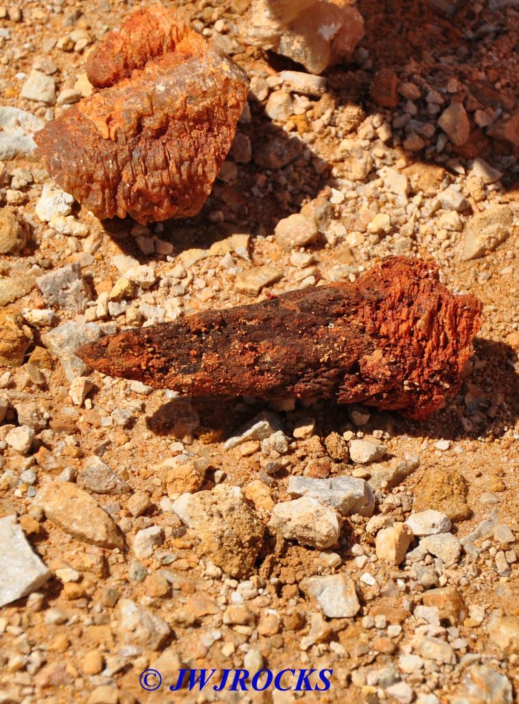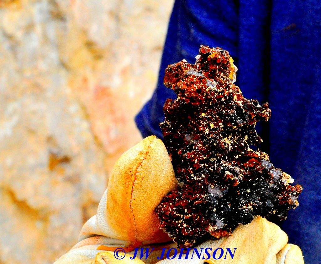 …and as you can see from the photos above, the blast pile was hugely still there, little had been worked to remove it…stretching back to the west much as it was the last time I was there. Soon I had my boots on and grabbed my gloves, tools and a bag and headed up into the base of the pile…and soon I was finding alot of dogtooth crystals, or what I would refer to as wanna be dogtooth crystals, five to ten inches long and a beautiful nestle chocolate brown color to them…many were upside down in what appeared as pockets blasted down from the wall intact and held in place by dirt and rock around them. It appeared they had been uncovered by the machinery recently, because they sure were not to be found or seen when I was there last…Justin was hollering every few minutes about finding something here and there, showing me some of his finds…..