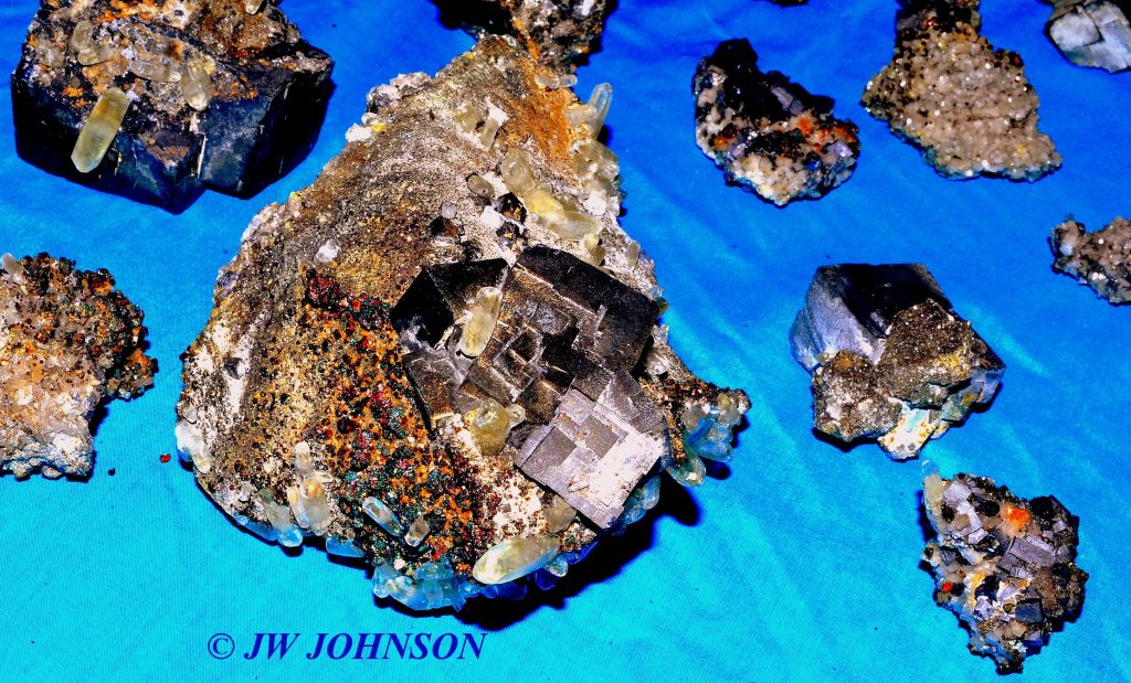 I was gonna crop this one off at the bottom of the image, then noticed Lola down there and decided to leave it…she is David`s guard dog for his Mom and a very pretty German Shepherd too. Those are some unique lead cube clusters above on the table, some with chalcopyrites attached. Closeup of the big one in the next two images….