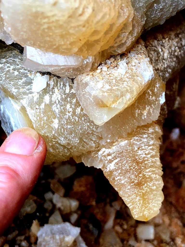 …I pointed out the coved wall and told Justin that when MAGS was there in April, the quarry personnel had cleaned off the upper ledges and hundreds of dogtooth crystals landed down below on the floor and in the smaller piles near the coved wall….so he migrated over there to see what he could find…