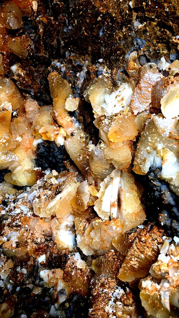 By this time, I was quickly running out of energy, having spent most of it at the druse spot and using up much of the rest of it trying to find Justin a dogtooth pocket so he could take home some beauties….it`s great to receive minerals and crystals as gifts but everyone likes to find them on their own even more, the thrill of pulling them out of a pocket is just much more exhilarating. I wasn`t able to find anything substantial, so Justin decided to try the wall on the north side, which is more vuggy and has produced many of the huge pockets I have found in the past. He walked over and came in from the top, taking my advice on how to reach the bottom, watching for plates of druse quartz that are often found over there…he did….