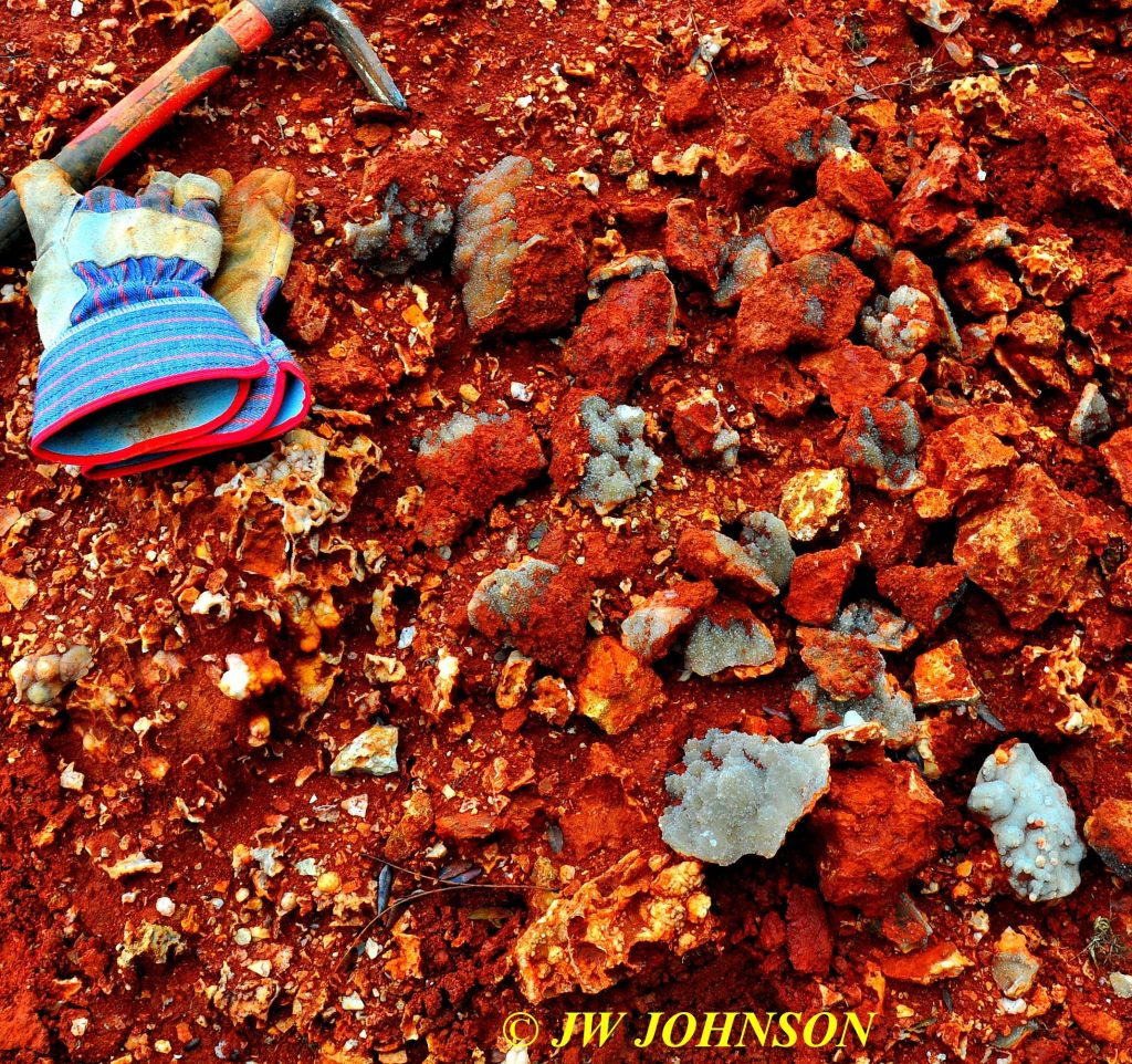 I had a phone call a few weeks ago from my buddy David Hodge, who is the Field Trip Director for the CAGMAGS Club, sister club to MAGS, the Memphis Club I have been a member of for several years now. CAGMAGS is located in central Arkansas near Little Rock, they come up with MAGS sometimes to collect with me up here and sometimes they just contact me and come up on their own and invite MAGS to go with them. David let me know he was going to be in St Louis for a marching band event for a few days and would be returning home after the Saturday event, asked if I could take him rockhunting on that Sunday morning. I told him it was his lucky week cause I had planned to go rockhunting that Sunday and assured him he was going to love it. We planned to meet up at a familiar pull off spot nearby, and I took him to the SSQ area and showed him the smokey druse plates I had been finding there. Needless to say, we found a bunch of them and had a great time, before he took off for home. He contacted me a couple of days later and asked if he could come back the next weekend and do that again and I said sure…cause I needed to get some together to take to Arkansas with me on my upcoming trip there…I let him know where we were gonna go down there and extended an invitation to join us at the privately owned mines we were going to. The second trip to the SSQ was a bit wet when we arrived….muddy I should say, they had quite a bit of rain the day before apparently….our trucks got muddy just driving up the druse road…..