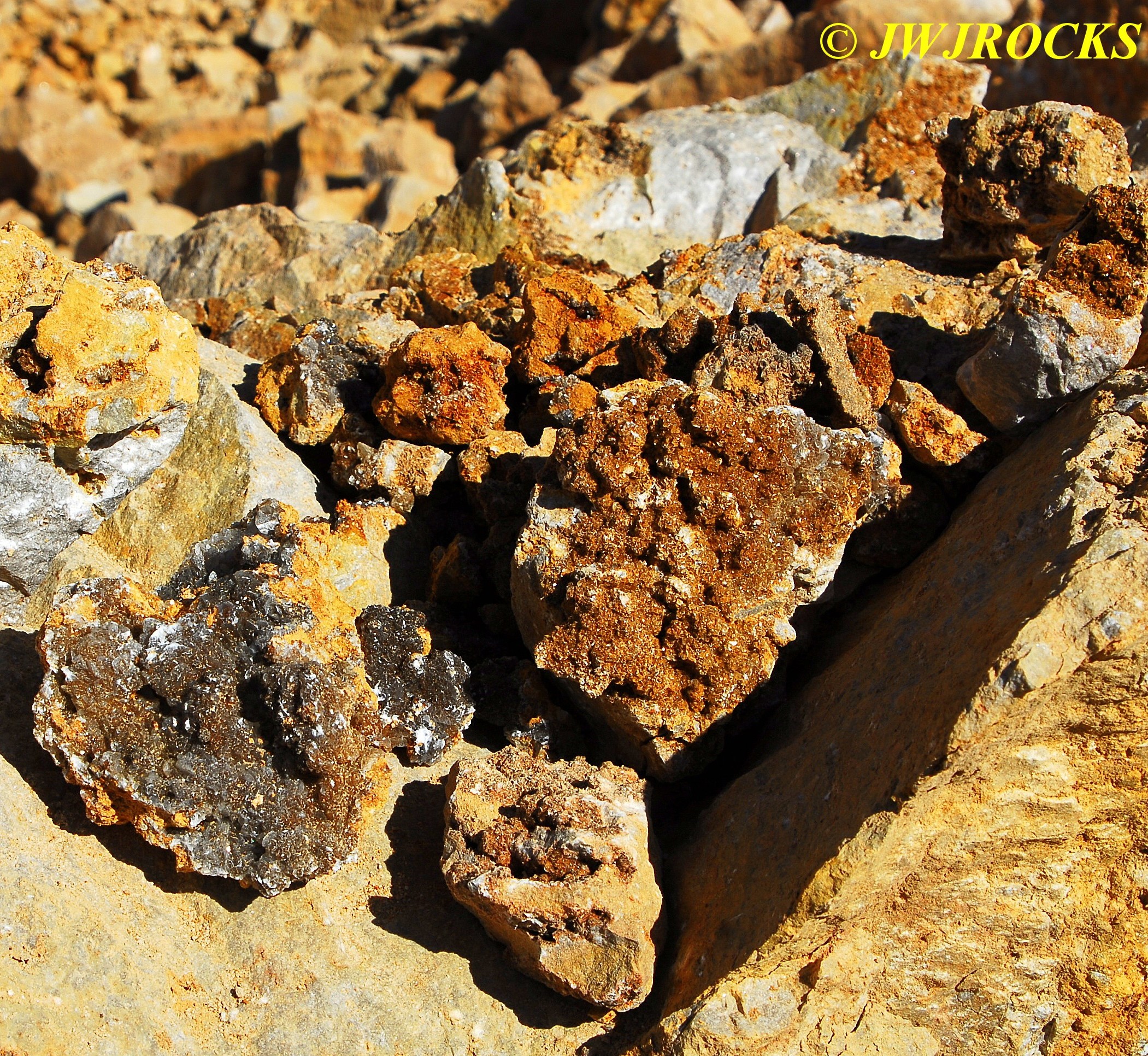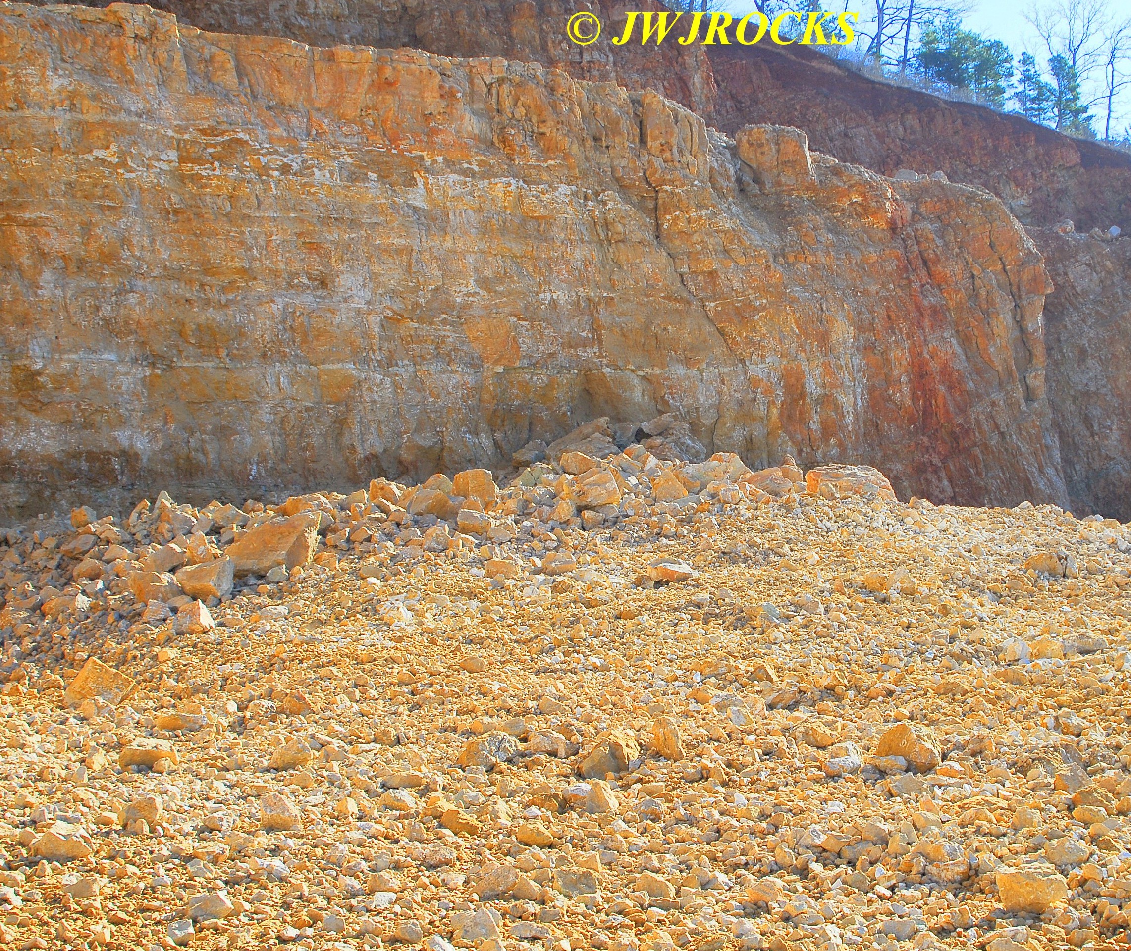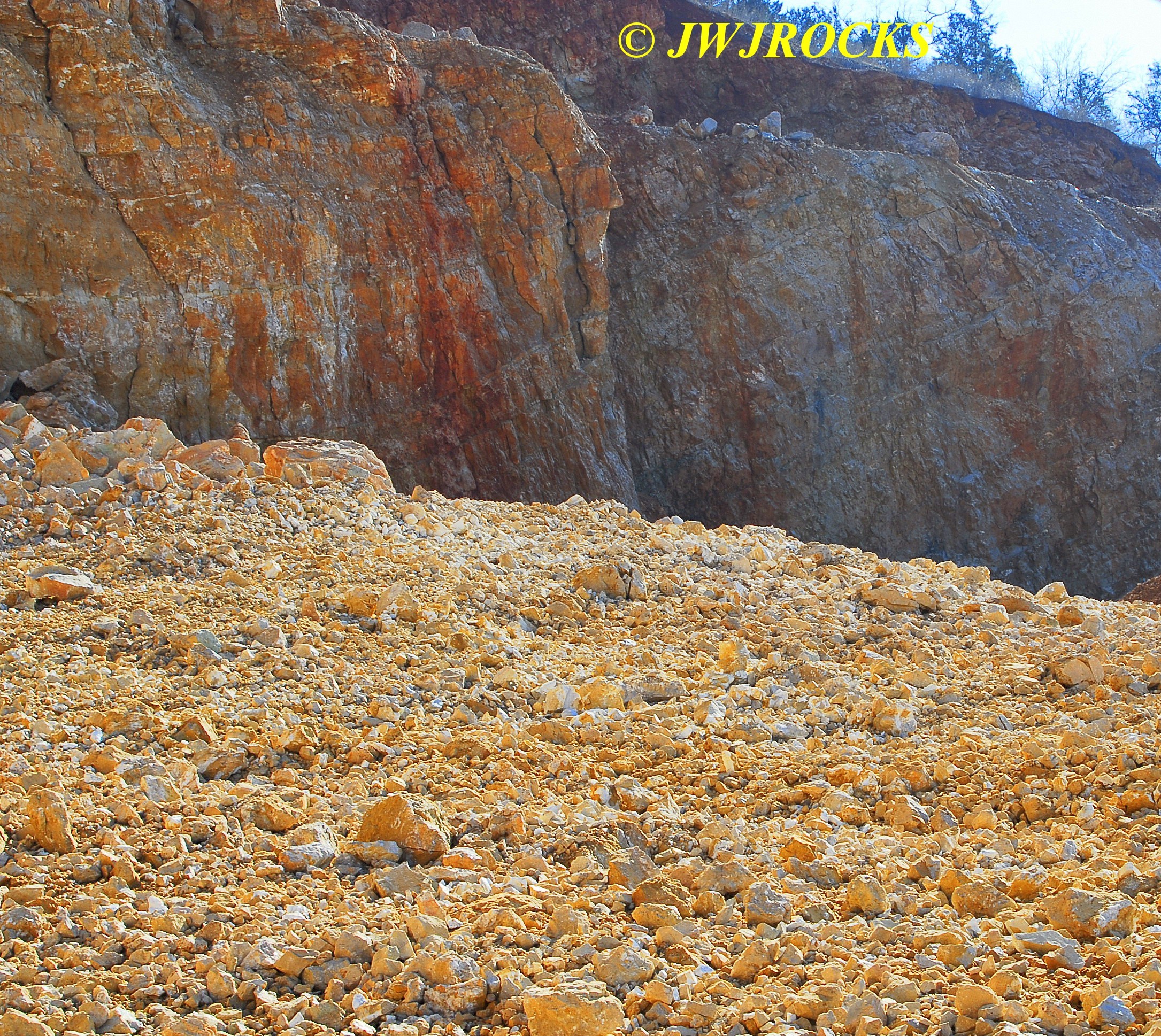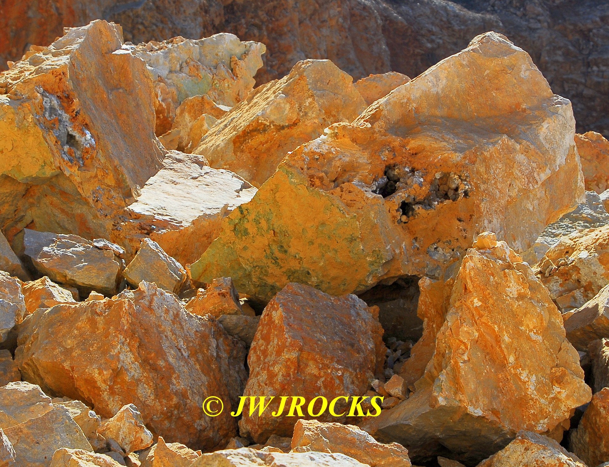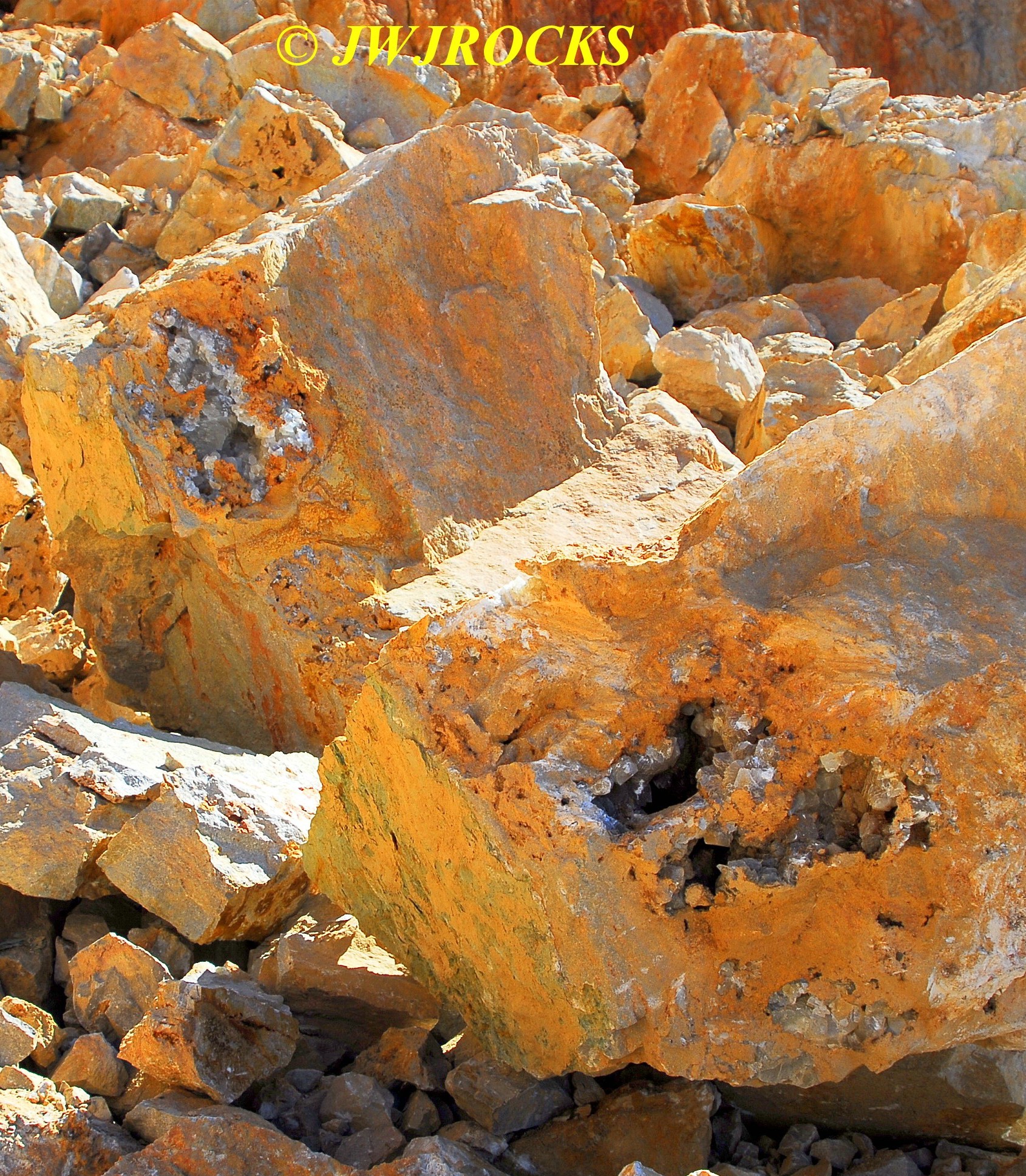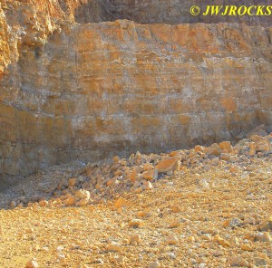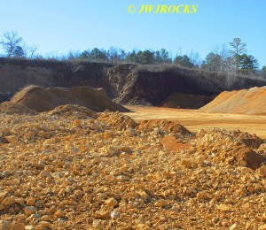 …I then looked toward the back center wall, however I was unable to see the back wall due to a very high pile of rock crushed into chunks suitable for support and driveways….as we drove around this huge pile of crushed rock, I came upon a nicely sloped pile of untouched goodies blasted down from the upper bench…needless to say I was estatic because my buddy Jim was unaware of any recent activity, most likely due to his view from the roadway being blocked as mine was, by that huge pile of crushed rock. The pile was wide enough that it required four photos to show it….