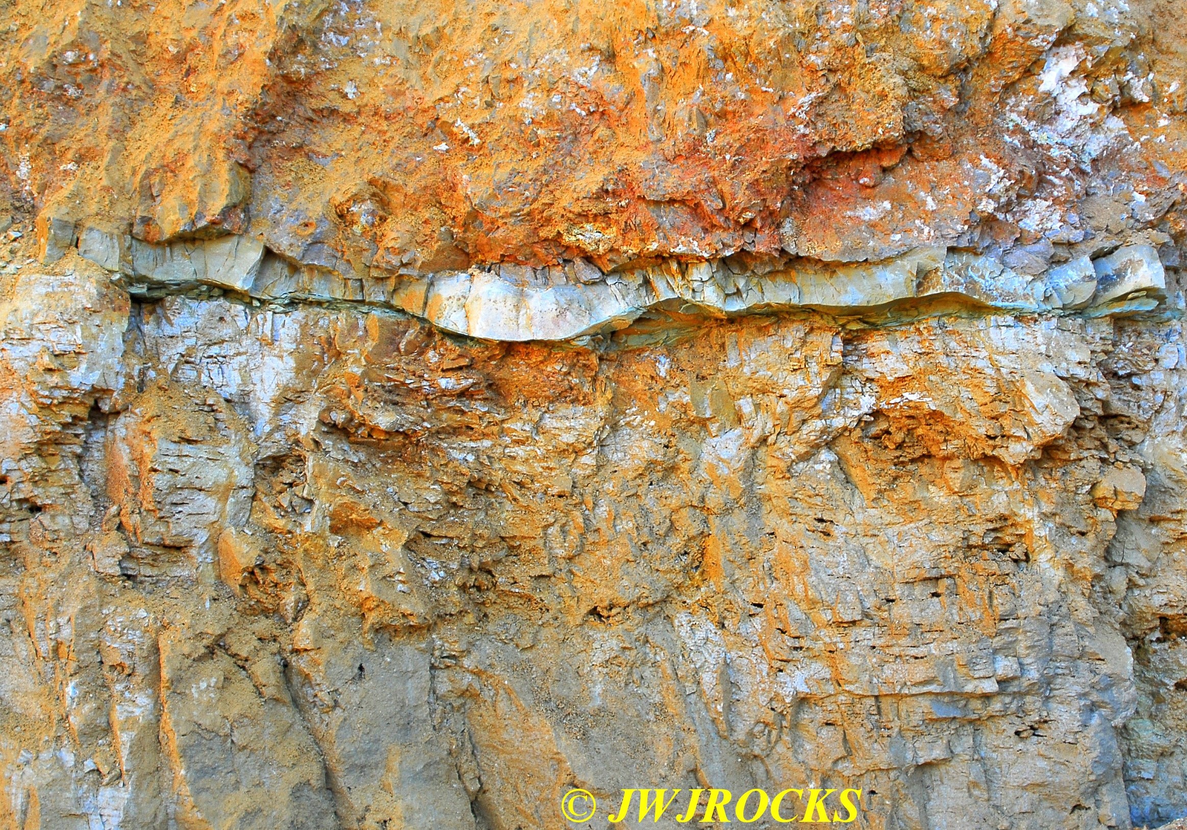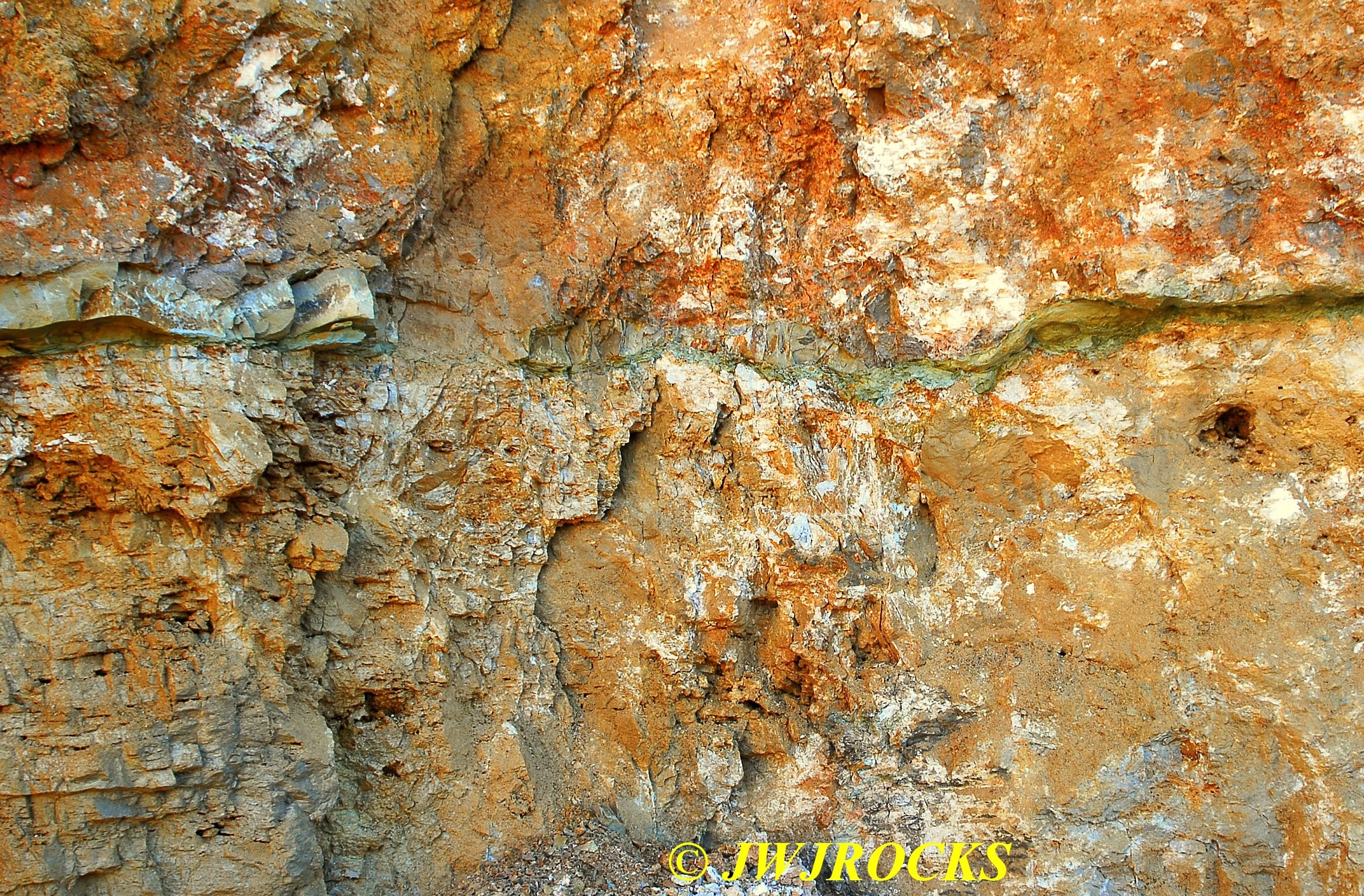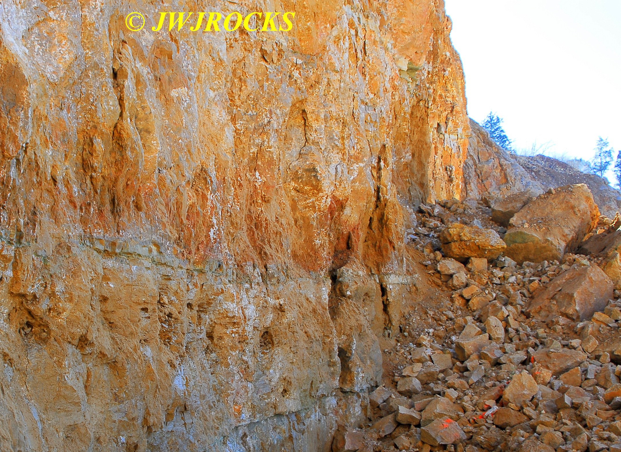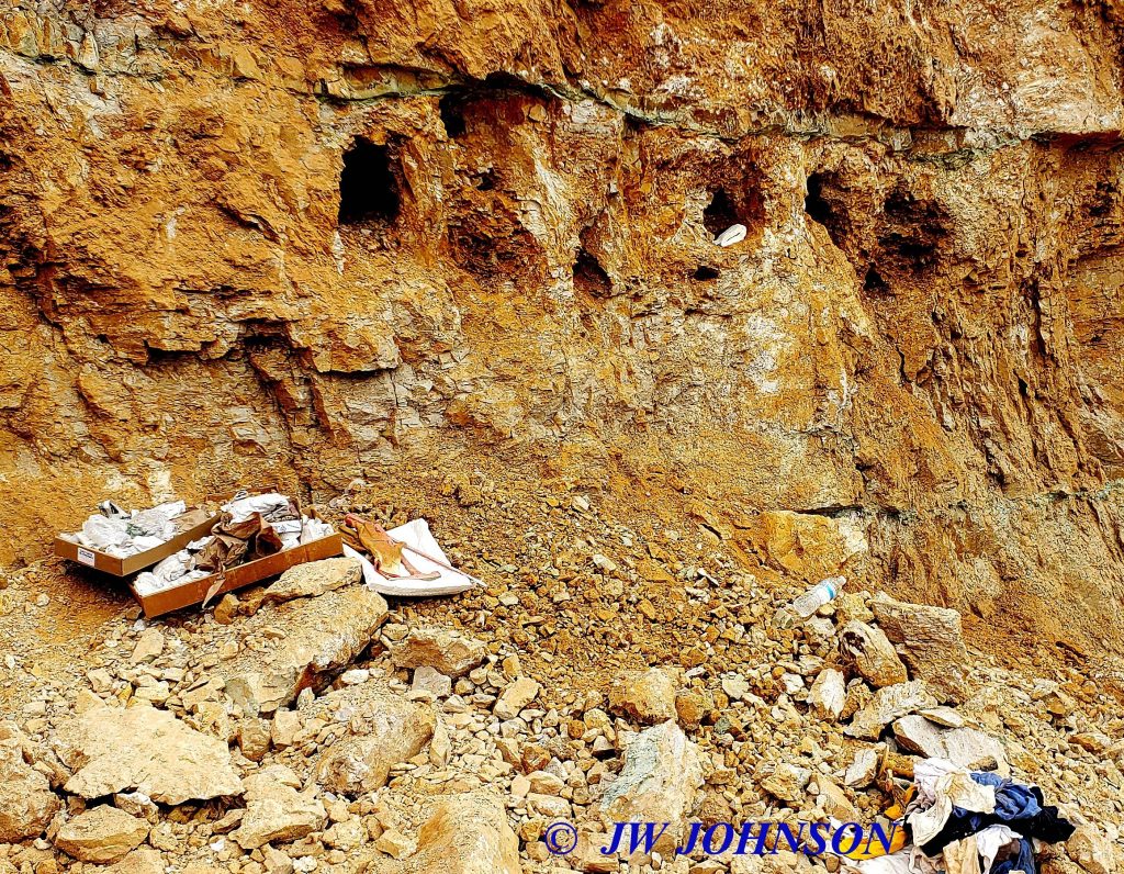 ….in fact, I was up along the wall and working on cleaning out the third pocket when my buddy Ian called me from Denver, to see what I was up to…and I told him what I was up to…he reminded me that he was going to be stopping off a week later to rockhunt with me on his way back home from New York state…I promised him that I would leave him some material there. A few minutes later tho, I had located a pocket up higher on the wall than I could reach…..center of the photo below….it was about ten feet up from the pile….