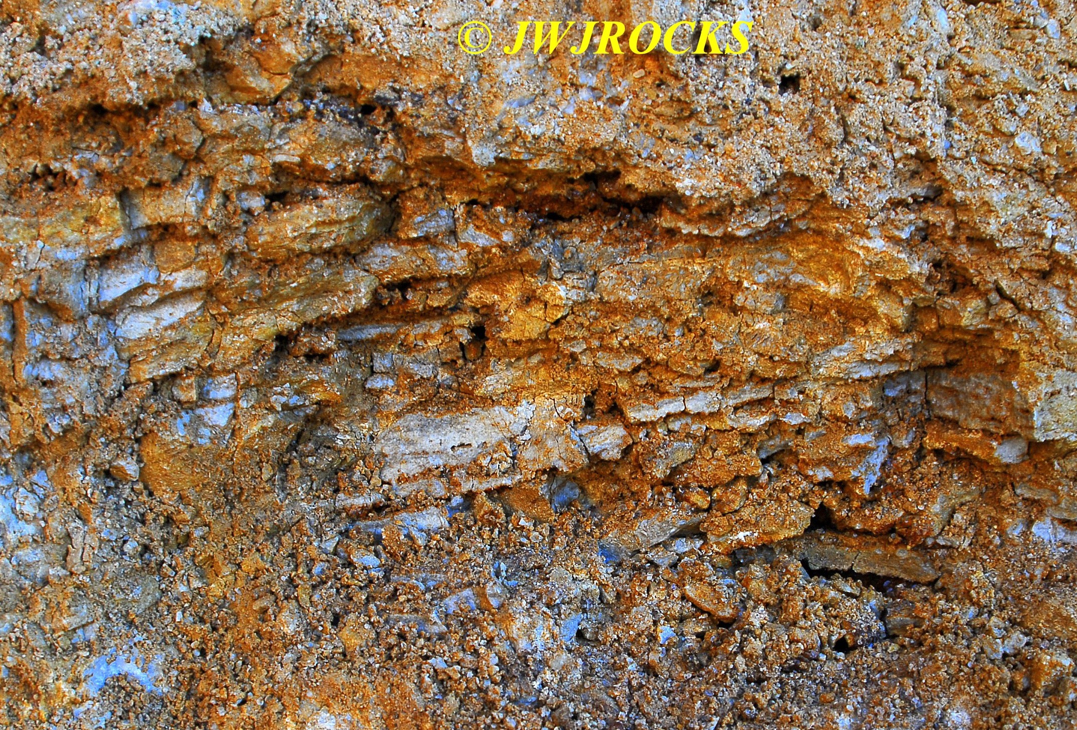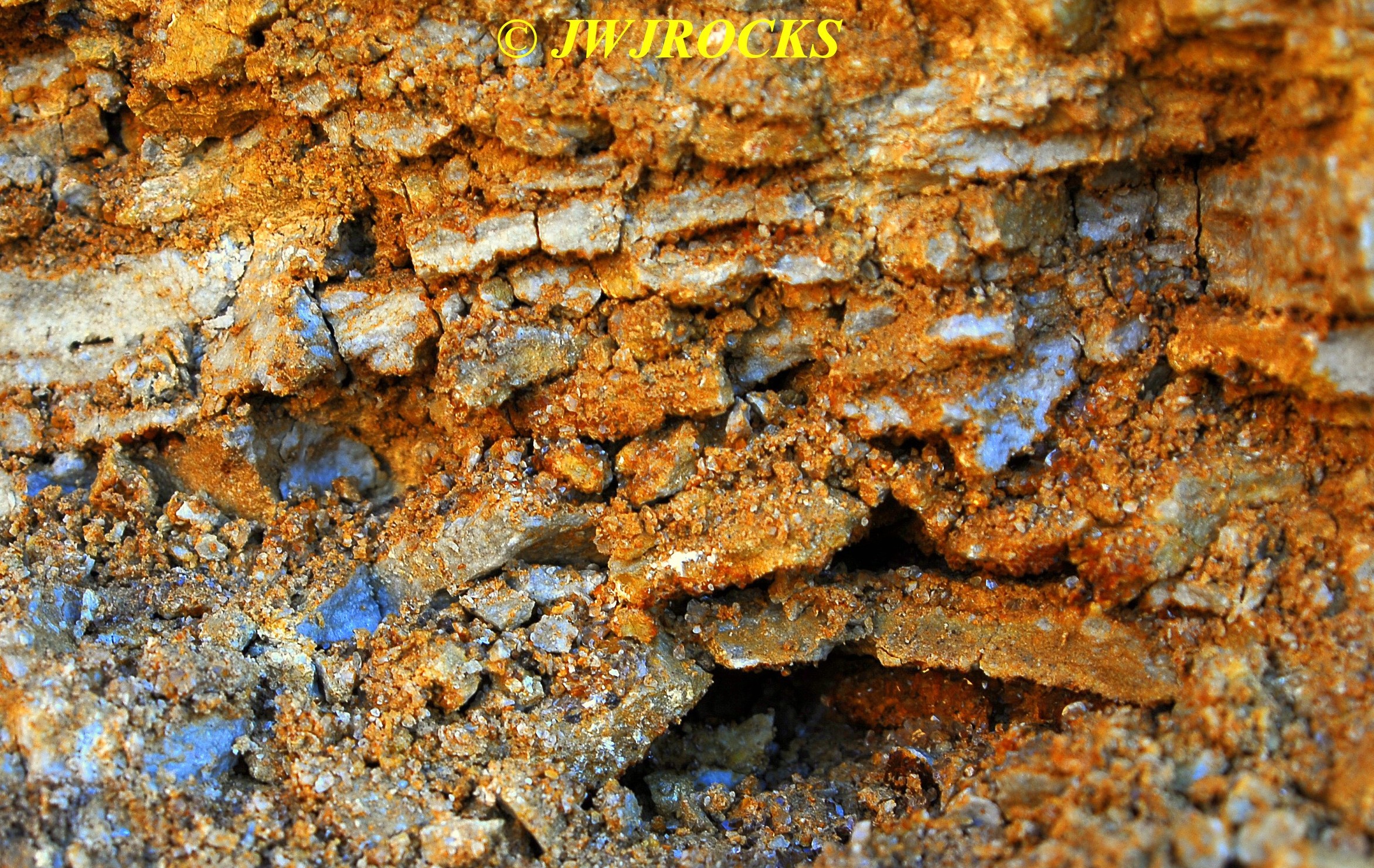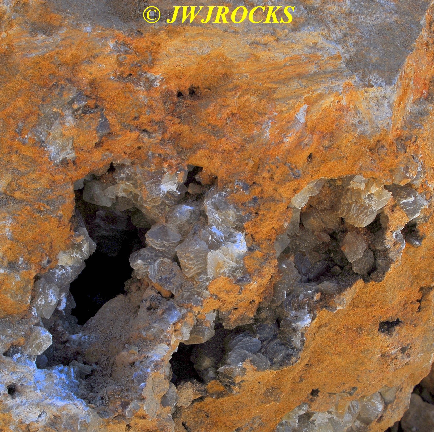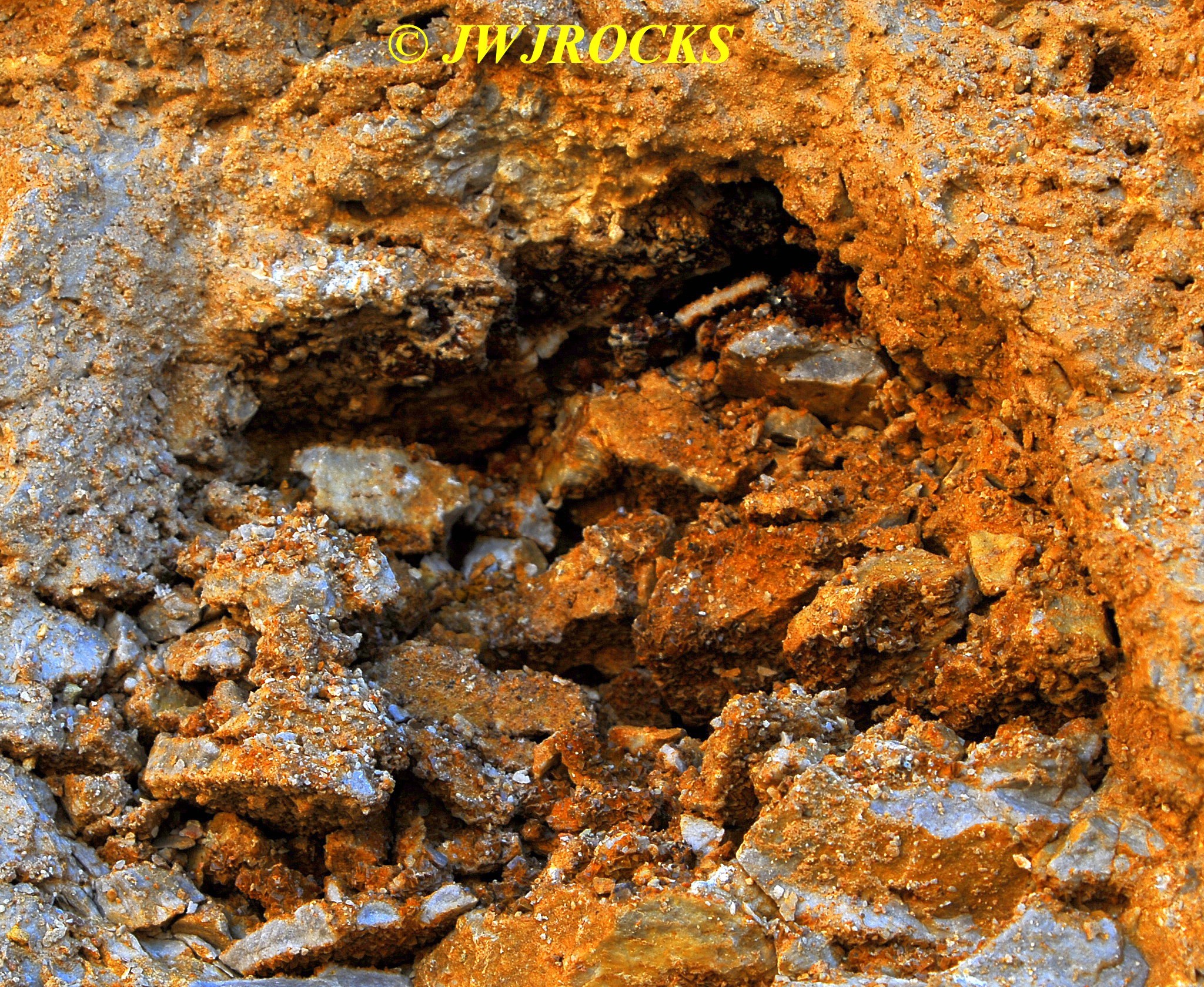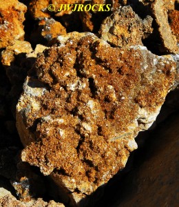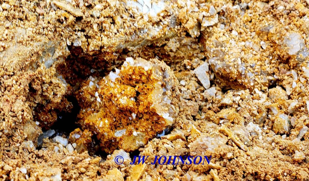 …after quickly letting Missy out, I changed into my boots, grabbed my mini mattox, and made a fast walk around the front edge…it was obvious the only thing workers had done since bringing the wall down, was to clean up the front edges with the dozer. I didn`t find anything pretty out on the front edges, so I grabbed a bag and headed for the back wall, as I was able to spot some pockets from the truck. Within moments, I had spotted several nice druse pockets like this one….