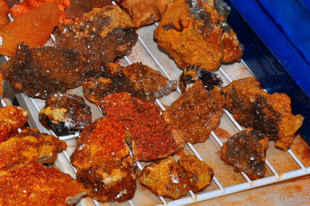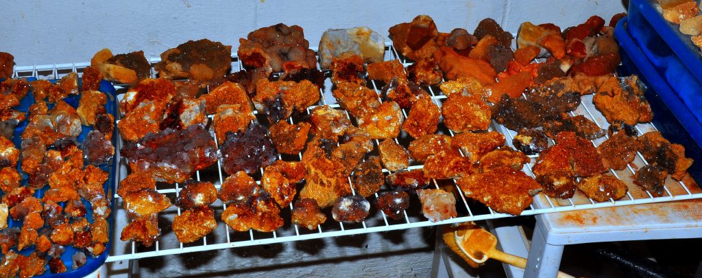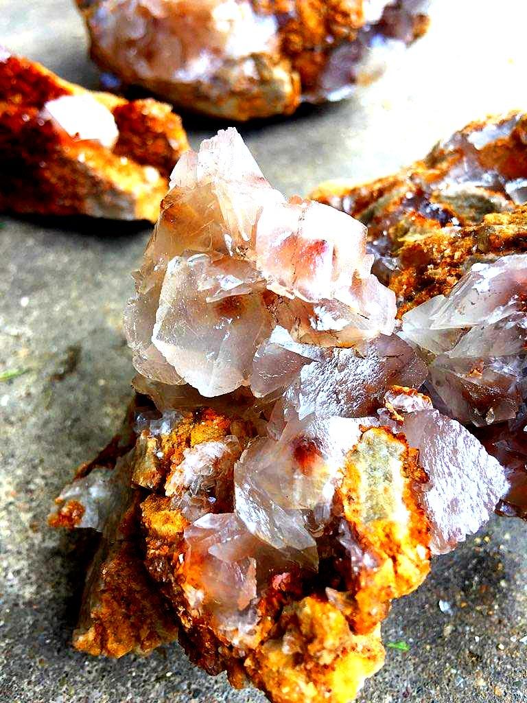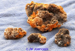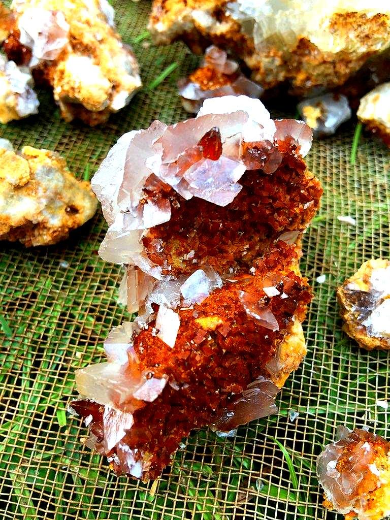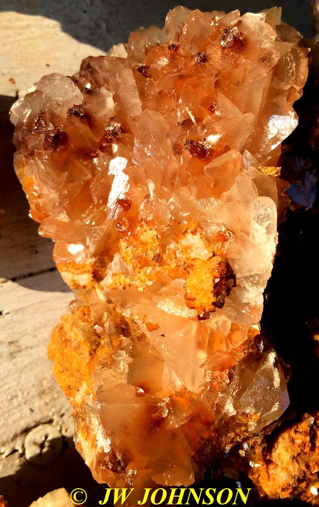 I had been up on that bench a few weeks back and found just a few pockets with some nice calcite druse and poker chips mixed in, some of them had some nice dogtooth crystals as well…. on a Saturday, and then the next day I drove down to a location that a good friend of mine had told me about last year…I refer to it as the new secret spot….a location that has proven to be a very good place to find some great clusters of crystals, especially dogtooth crystals…on that particular day a few weeks ago, I def found something worth writing home about, but have chosen not to until recently when I told a few close friends about it. Suffice to say, I had a field day that day and brought home several canvas bags full of wrapped goodies, clusters, singles, twins, triples, all bright orange dogtooth crystals, from micro size to beachball sized, many of each. It`s been a few weeks and I am still cleaning many of them. I`ll post some photos of them when I get them cleaned up…I had a few of them cleaned up and on display when some new rock collecting friends showed up last week for a visit, and they were pretty impressed with them as well.