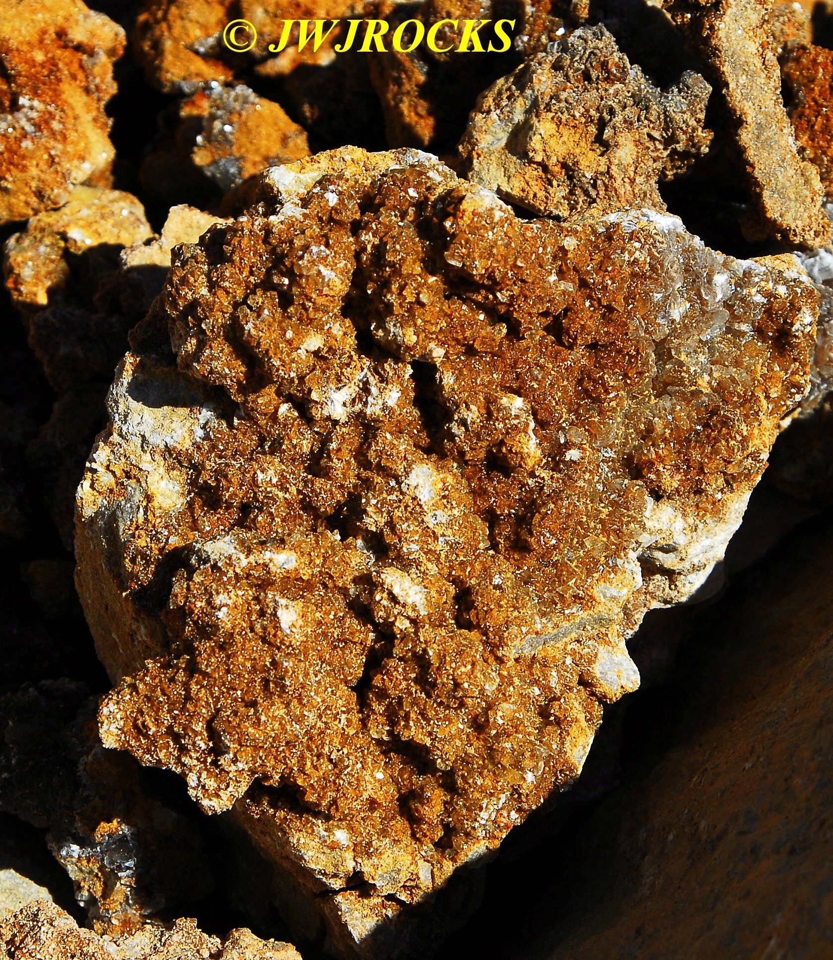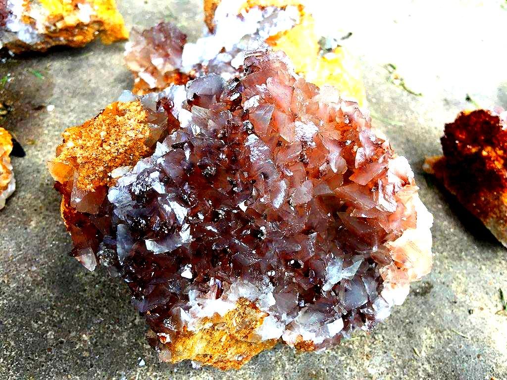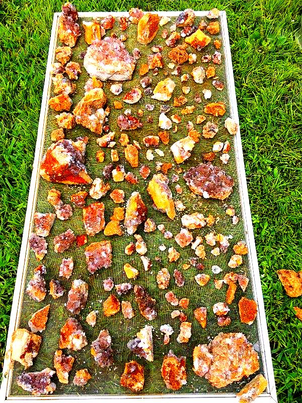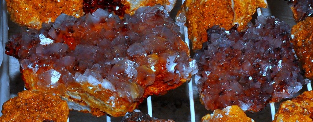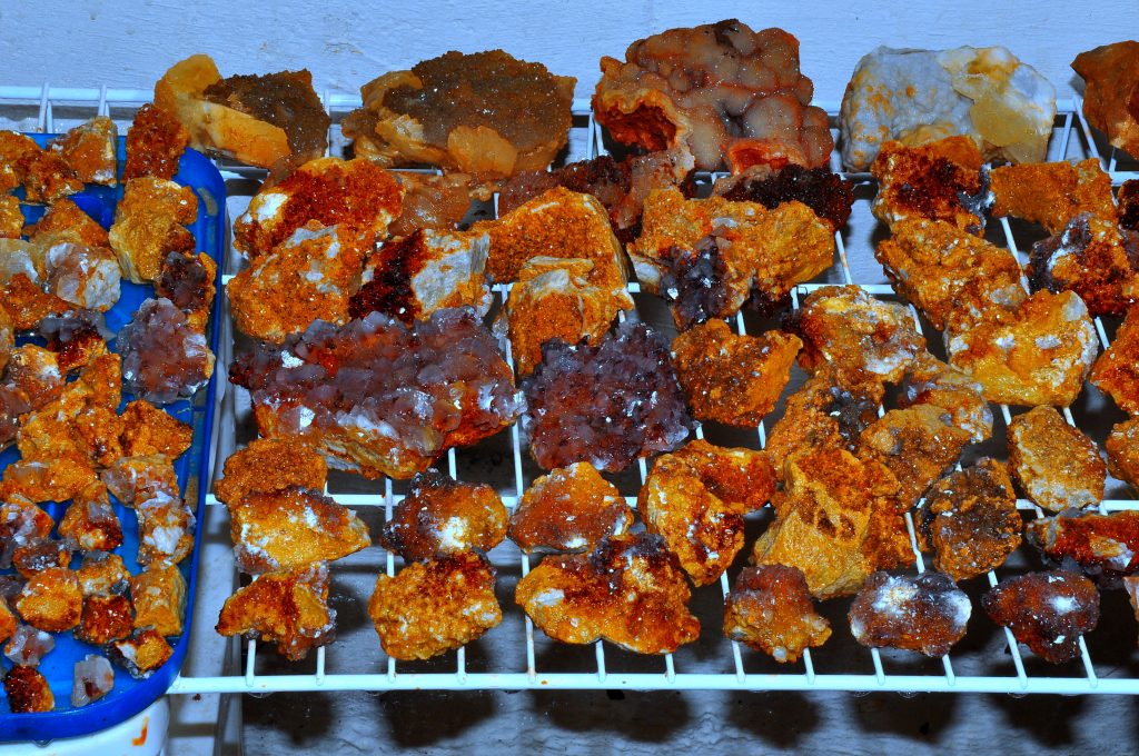 I had been up on that bench a few weeks back and found just a few pockets with some nice calcite druse and poker chips mixed in, some of them had some nice dogtooth crystals as well…. on a Saturday, and then the next day I drove down to a location that a good friend of mine had told me about last year…I refer to it as the new secret spot….a location that has proven to be a very good place to find some great clusters of crystals, especially dogtooth crystals…on that particular day a few weeks ago, I def found something worth writing home about, but have chosen not to until recently when I told a few close friends about it. Suffice to say, I had a field day that day and brought home several canvas bags full of wrapped goodies, clusters, singles, twins, triples, all bright orange dogtooth crystals, from micro size to beachball sized, many of each. It`s been a few weeks and I am still cleaning many of them. I`ll post some photos of them when I get them cleaned up…I had a few of them cleaned up and on display when some new rock collecting friends showed up last week for a visit, and they were pretty impressed with them as well.